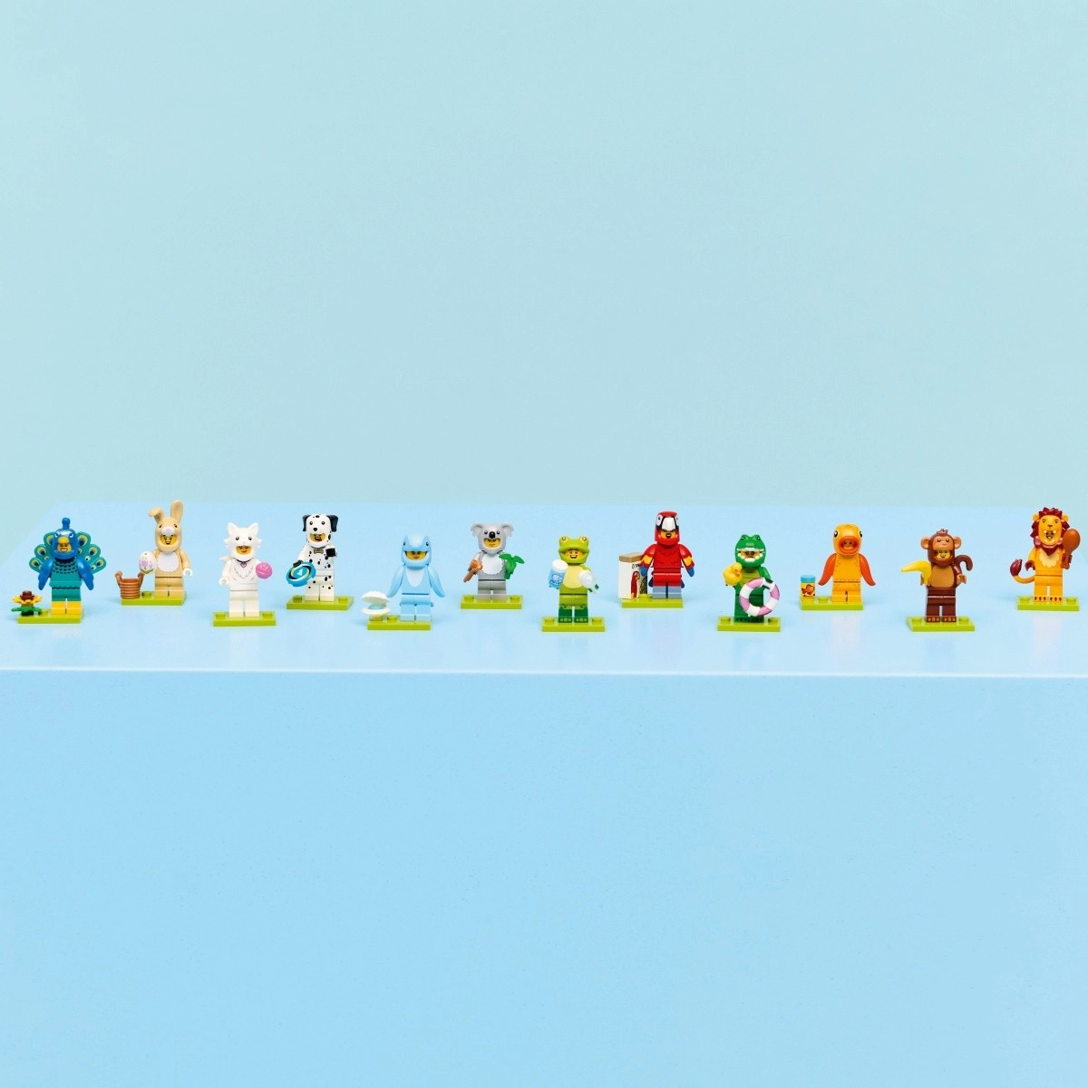 V sérii najdete postavy v kostýmech: papoušek, lev, žába, krokodýl, dalmatin, zlatá rybka, roztomilý králíček, páv, hebká kočka, koala, delfín a opice. Každá figurka je ukrytá v zapečetěném tajemném boxu, takže překvapení je zaručeno – nasbírejte všech 12 minifigurek a rozšiřte svou LEGO výstavku nebo herní svět.