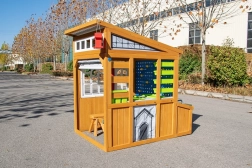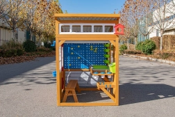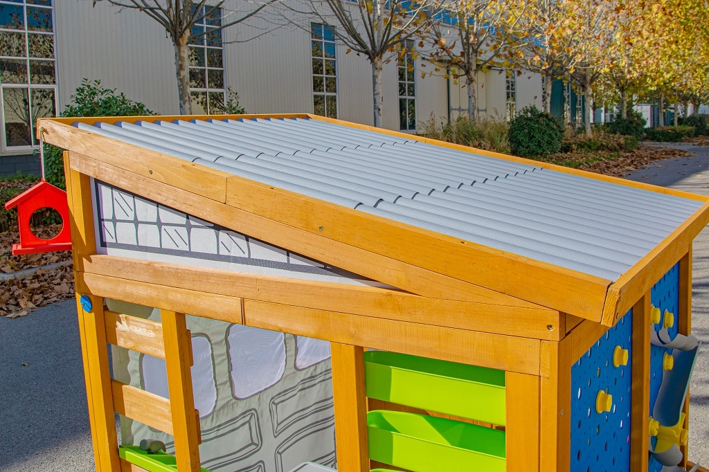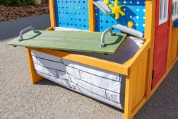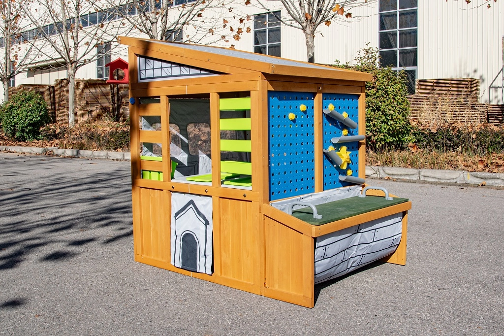 Zahradní domeček Hobby Workshop promění vaši zahradu v bezpečné a podnětné hřiště. Robustní dřevěná konstrukce se šikmou střechou připomíná malou dílnu a láká k nápadité hře. Děti si užijí otevírání a zavírání rolovacích vrat s klikou, experimentování na kolíkové stěně i práci na zvýšeném stole s praktickou pracovní deskou.