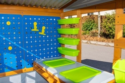 - Kreativní STEM prvky – kolíková stěna a pracovní plocha pro bádání a tvoření.