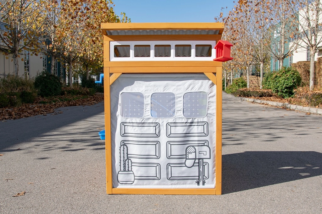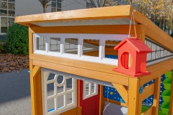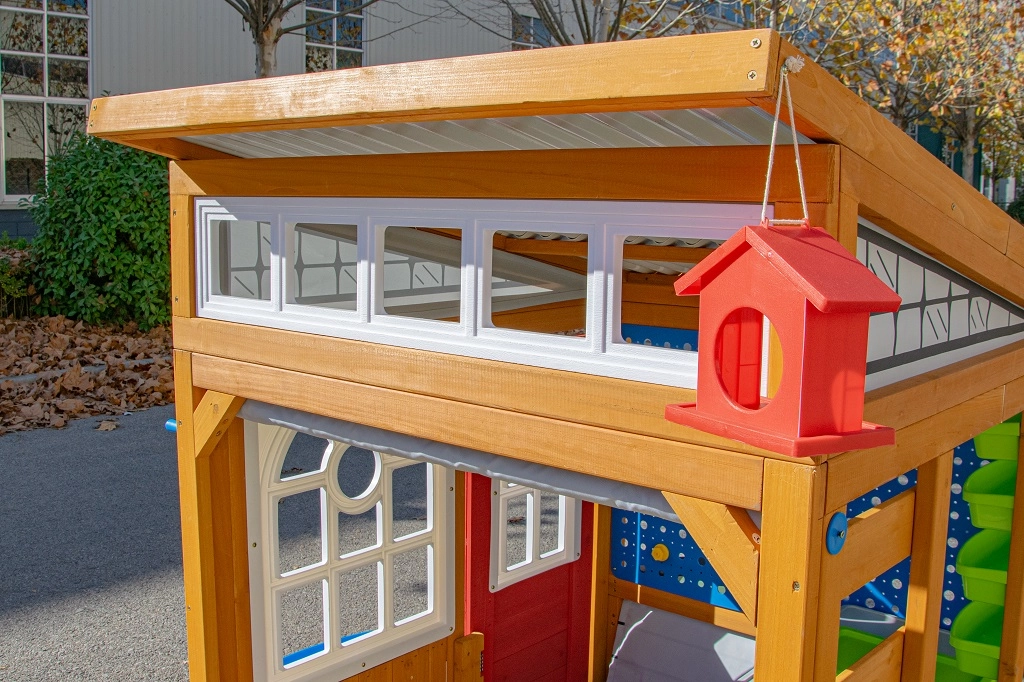 Rolovací „garážová“ vrata s klikou, odolná lavice s nosností 100 kg a detaily jako krmítko pro ptáčky a okenní truhlík propojují hru s okolní přírodou.