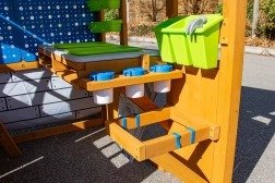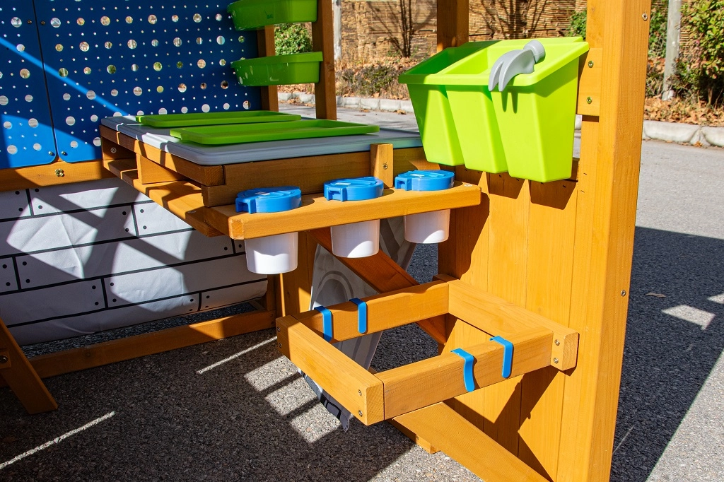 Zvýšený stůl s pracovní deskou, poličkami, koši a kelímky udrží nářadí i materiály vždy po ruce. Děti si osvojí organizaci a samostatnost při tvoření i pokusech.