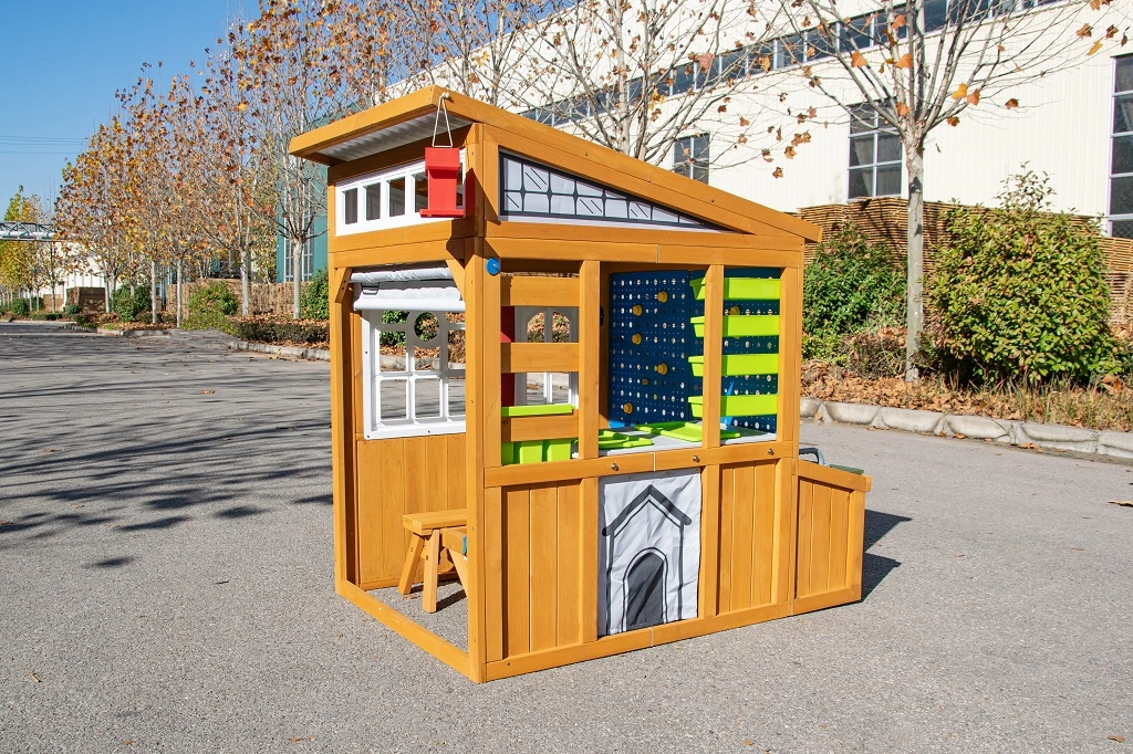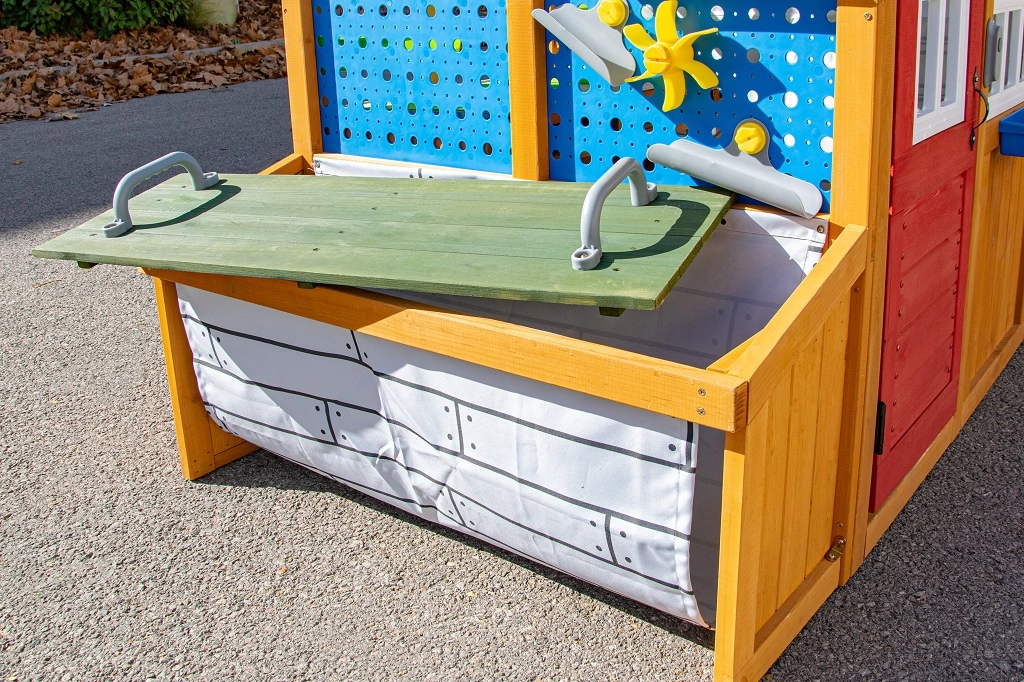 Dejte dětem prostor objevovat, konstruovat a tvořit. Tento dřevěný zahradní domeček s dílenskými prvky nabízí kolíkovou stěnu, pracovní stůl a rolovací „garážová“ vrata. Díky chytrému úložnému systému, lavici a doplňkům jako krmítko pro ptáčky či okenní truhlík podporuje kreativitu, fantazii i společnou hru více dětí na zahradě.