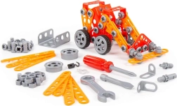 Součástí jsou šroubky, matice, držáky a dětské nástroje – šroubovák a klíč – pro snadnou montáž i demontáž.