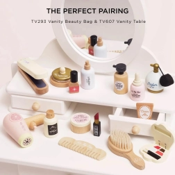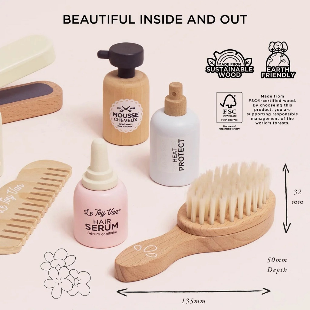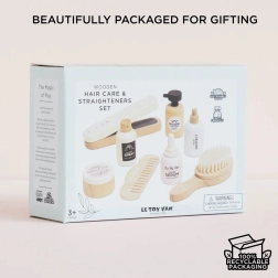Dětská kadeřnická sada Le Toy Van přináší hodiny kreativní zábavy pro malé stylistky a stylisty. Obsahuje 8 kvalitních dřevěných dílů včetně žehličky na vlasy, kartáče, hřebenu a kosmetických doplňků pro fiktivní péči o vlasy. Je vyrobena z FSC certifikovaného dřeva, ručně domalována netoxickými, vodou ředitelnými barvami a splňuje přísné bezpečnostní standardy. Rozvíjí představivost, sociální dovednosti a jemnou motoriku dětí od 3 let.