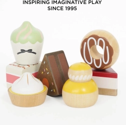 Dodejte dětským hrám sladkou atmosféru s elegantním dřevěným stojanem na dorty LE TOY VAN. Tento kvalitní doplněk do dětské kuchyňky nabízí tři patra pro servírování, 7 detailně zpracovaných dřevěných dezertů a je vyroben z FSC certifikovaného dřeva s netoxickými vodovými barvami. Je bezpečný pro děti, plast-free a podporuje kreativitu, fantazii a jemnou motoriku.