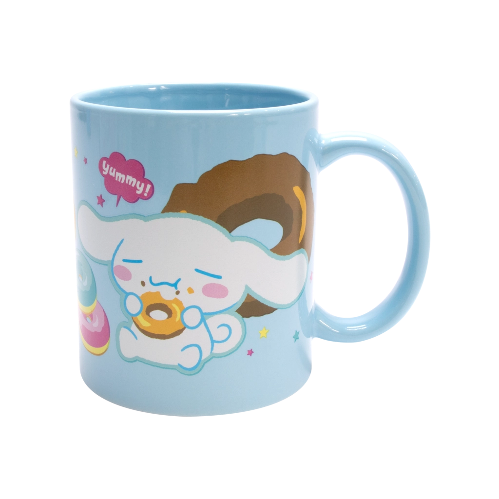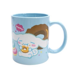 Světle modrý keramický hrnek s potiskem Cinnamoroll a donutů, ideální na ranní kávu i večerní čaj. Lesklá glazura a pohodlné ucho pro příjemné držení.