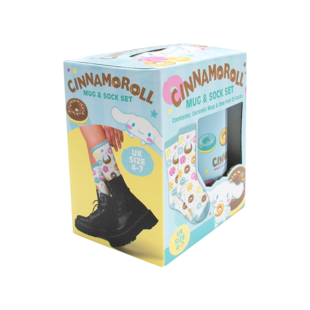 Tento půvabný set spojuje praktický hrnek a pohodlné ponožky v jednotném pastelovém designu s motivem Cinnamoroll a barevných donutů. Hrnek s objemem 330 ml se hodí na kávu, čaj i horkou čokoládu, zatímco příjemné ponožky s pružným lemem zahřejí a potěší každým krokem.