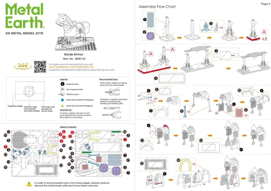Vyjměte díly z kovových plátků (doporučeny malé štípací kleštičky), spojte je pomocí zámků se zobáčky a ohýbejte tenkými kleštěmi. Postupně zkompletujte všechny spoje a vytvořte realistický model koňského brnění.