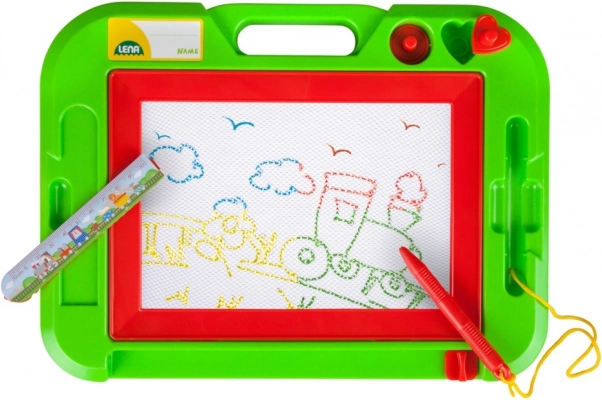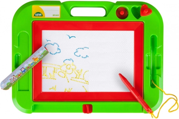 Dětská magnetická kreslicí tabulka od značky LENA podporuje kreativitu a jemnou motoriku. Součástí je tužka na provázku, 2 magnetická razítka a lišta pro rychlé mazání, díky které děti snadno začnou znovu kreslit. Při psaní kovovým hrotem se barevná plocha mění a vytváří živé obrázky.