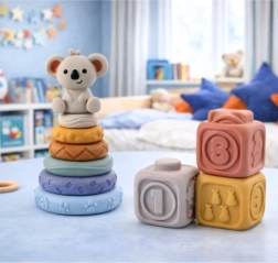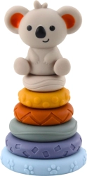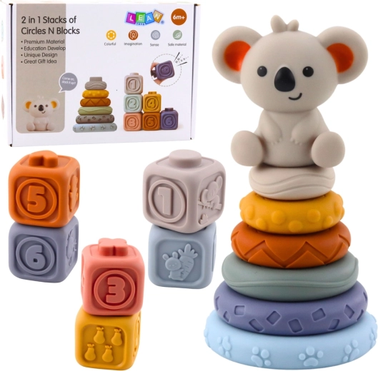 Tato 13dílná sada kombinuje stohovací věž se 6 kroužky a 6 senzorickými kostkami doplněnými o figurku koaly na vrcholku. Každý díl má jinou texturu, vzor či označení, které podněcují hmat, zrak i sluch, a tím rozvíjejí logické myšlení a trpělivost. Měkký, bezpečný silikon se příjemně mačká a je ideální pro malé ručičky.