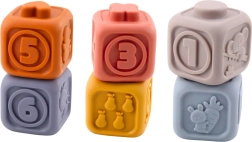 Kostky s reliéfními čísly, ikonami a tvary podporují rozvoj hmatu, učení barev a rané počítání. Lze je stavět, mačkat a kombinovat s věží.