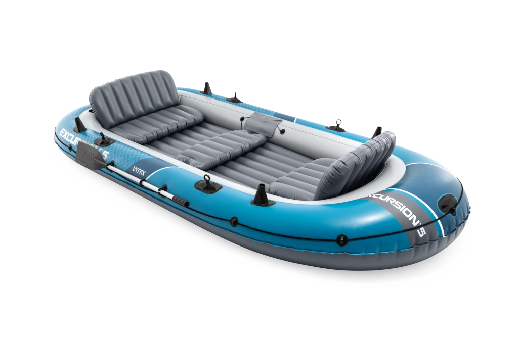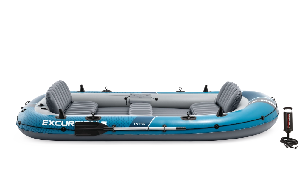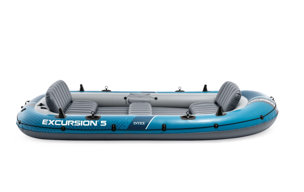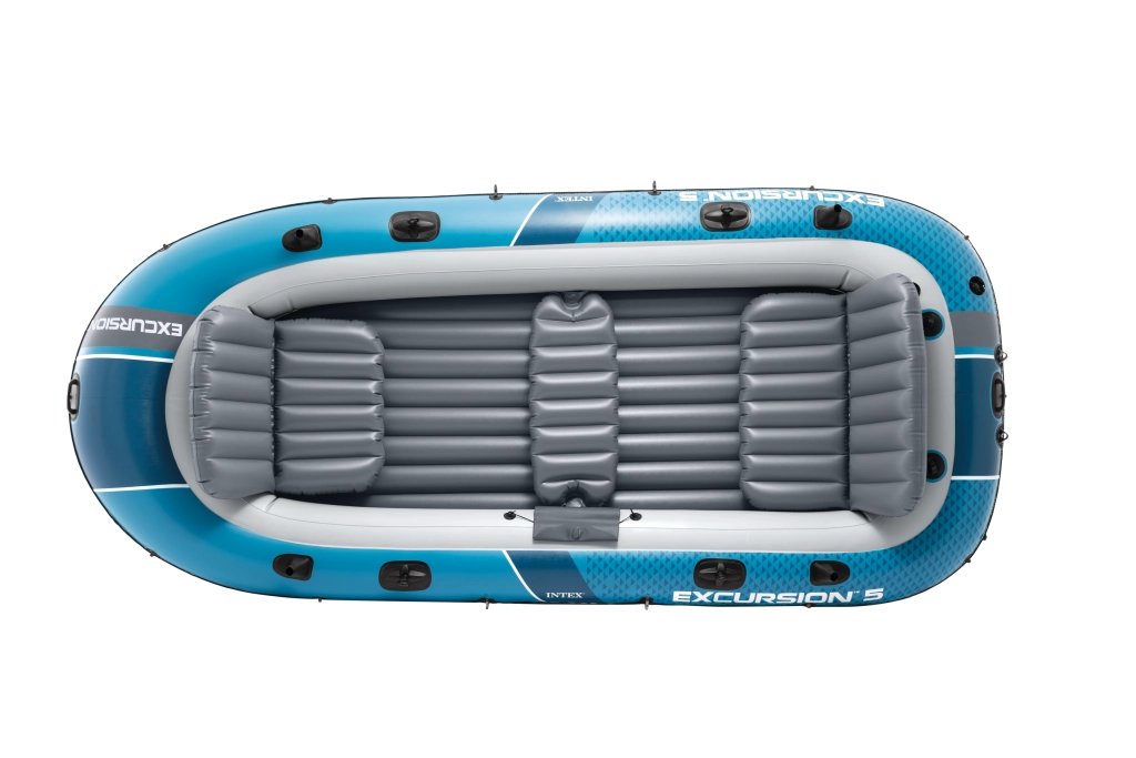Nafukovací člun INTEX Excursion 5 je spolehlivý parťák pro rodinné výlety, rekreaci i rybaření. Odolná konstrukce z vylepšeného PVC v modro‑šedé kombinaci s ochranným lanem po obvodu a svařovanými madly zajišťuje bezpečné nastupování i manipulaci. Tři samostatné komory a pomocná komora uvnitř trupu zvyšují vztlak a bezpečí na vodě.