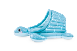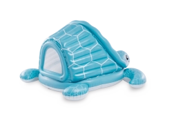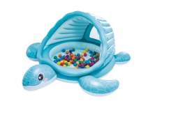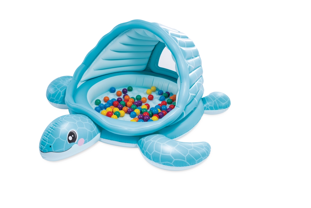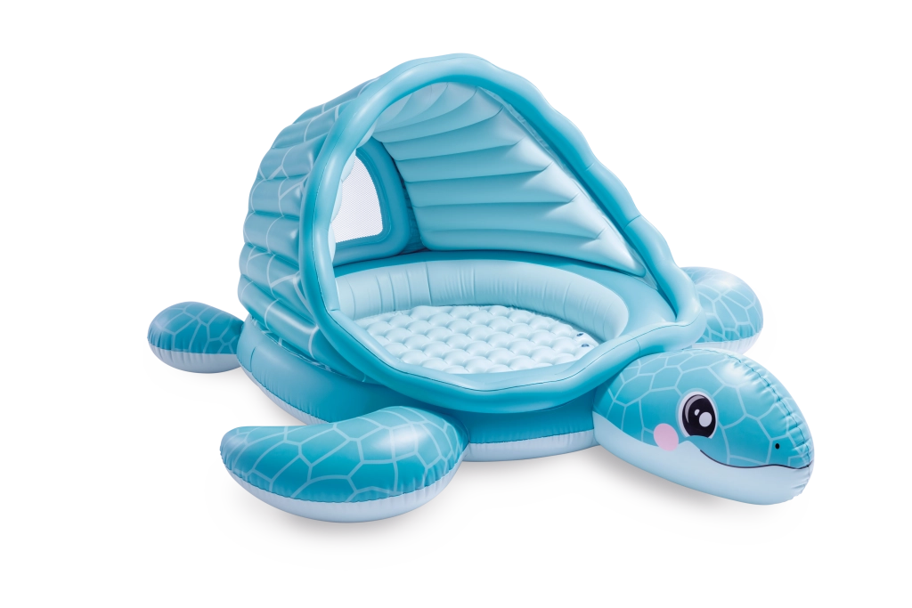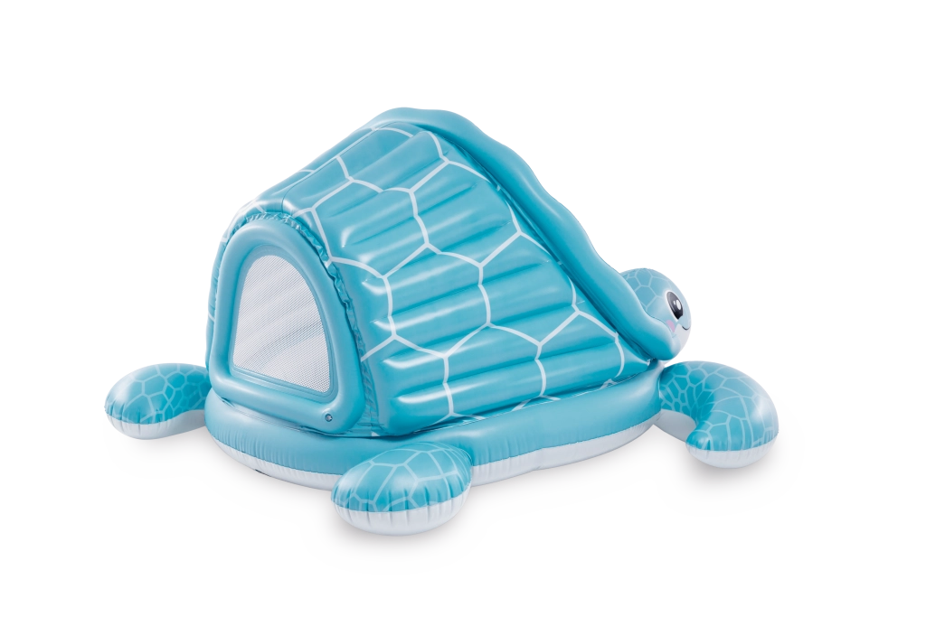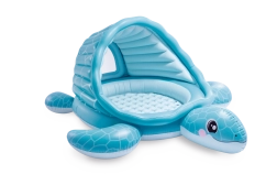 Nafukovací dětský bazének se stříškou Želví zátoka přináší kombinaci hravého designu a praktických funkcí. Světle modré provedení s motivem krunýře a veselou želví tváří zaujme na první pohled, zatímco měkké nafukovací dno zajistí pohodlí a tlumení nárazů na tvrdém povrchu.