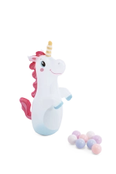 Nafukovací jednorožec a 8 barevných míčků podporují aktivní hru, házení přes obruč a rozvoj koordinace.