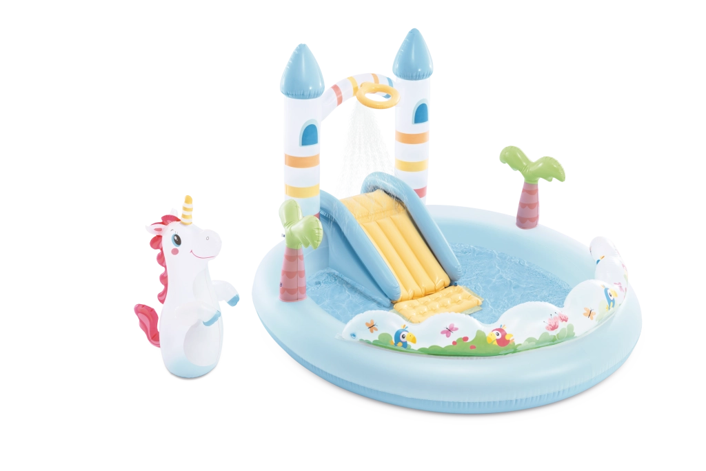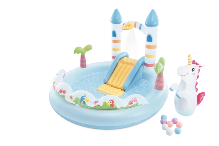 Udělejte z vaší zahrady pohádkové místo s hracím centrem Jednorožčí hrad – nafukovacím vodním setem pro děti od 2 let. Nabízí mělký bazének, měkkou skluzavku s polstrovaným dojezdem, vodní spršku po připojení hadice a zábavné doplňky včetně nafukovacího jednorožce a barevných míčků pro hru a rozvoj motoriky.