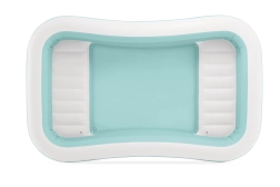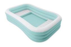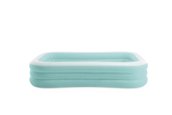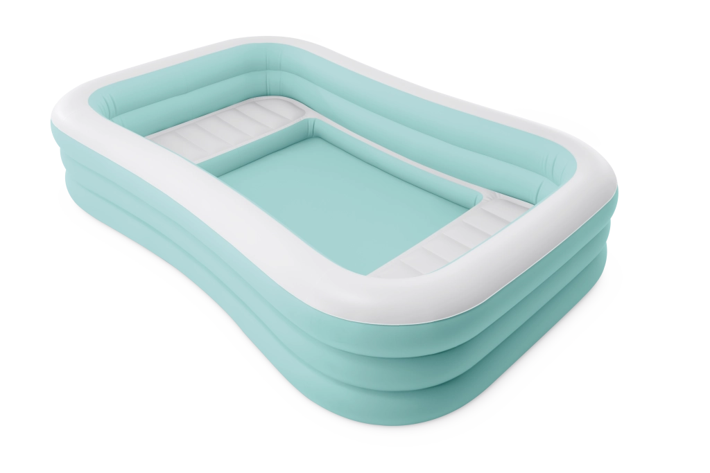 Nafukovací bazén Swim Center Family Lounge je ideální pro rodinný odpočinek na zahradě či terase. Obdélníkový tvar s lehce zaoblenými rohy a kombinace světle modré a bílé barvy působí svěže a elegantně. Tři samostatné nafukovací komory zajišťují pevnost, stabilitu a pohodlnou výšku stěn, takže si koupání užijí děti od 6 let i dospělí.