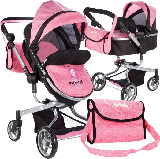 Stylový kočárek 2v1 pro panenky v růžovo‑černém provedení potěší každou malou maminku. Nabízí možnost používání jako hluboký i sportovní kočárek, má nastavitelnou rukojeť a bezpečnostní pásy pro panenku až do velikosti 55 cm. Součástí je praktická taška na drobnosti a spodní košík pro pohodlné převážení všeho potřebného.