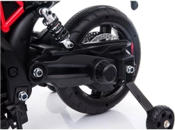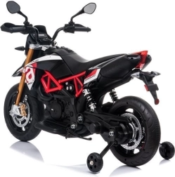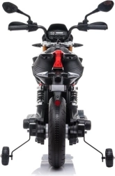 Elektrická motorka APRILIA A007 v černo‑červeném provedení věrně napodobuje skutečný sportovní stroj – od tvaru kapotáže přes kotoučové brzdy až po zadní tlumiče. Stabilizační kolečka jsou nenápadná, takže malý jezdec vypadá jako opravdový motorkář, přitom má zajištěnou stabilitu a bezpečí. Plynulou jízdu doplňuje realistické přední LED světlo a pohodlné stupačky.