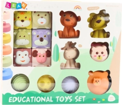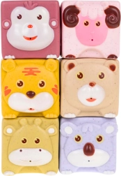 - 6× čtvercové kostičky se zvířátky, 6× kulaté díly pro stavění věže, 3× figurky zvířat, 3× senzorické míčky