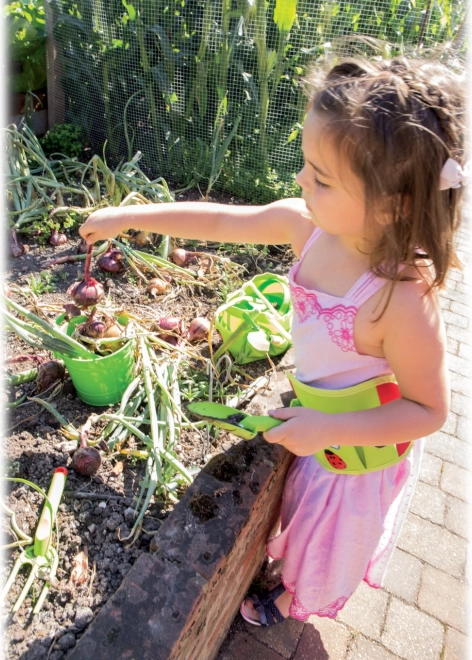 Praktický textilní opasek udrží rýček, hrabičky i rukavice bezpečně uložené a vždy na dosah. Děti mohou volně běhat po zahradě bez ztrácení nářadí.