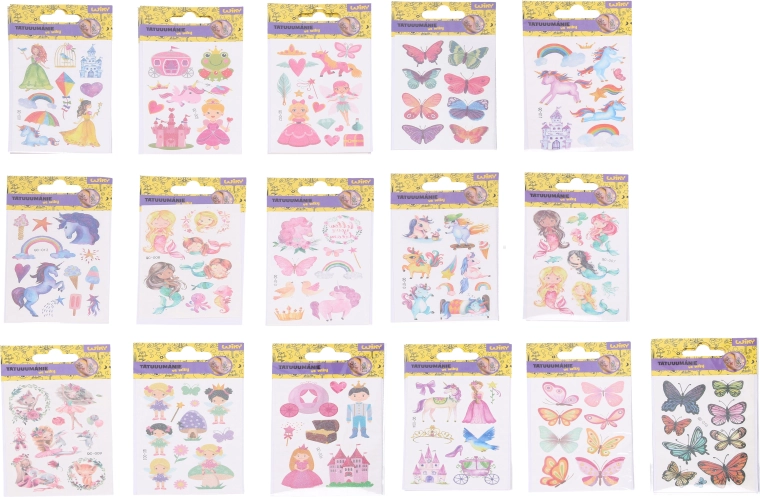 Dočasné tetovací obtisky v praktickém formátu 7,5 × 11 cm přinášejí pestrý výběr motivů pro děti i dospělé. Najdete zde víly, mořské panny, jednorožce a motýly – ideální na oslavy, festivaly i běžné nošení. Snadná aplikace, výrazné barvy a krátkodobá výdrž bez závazků potěší každého.