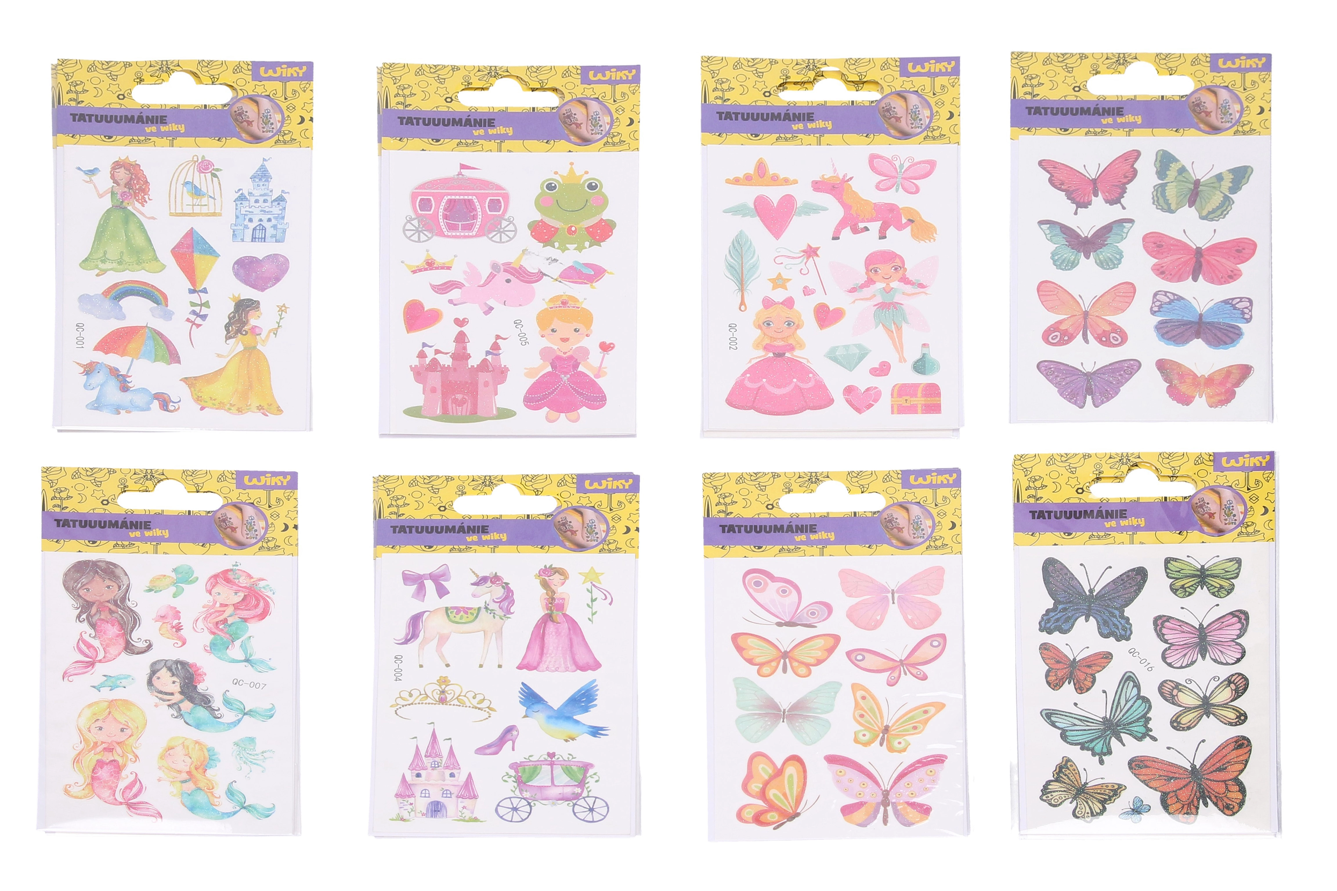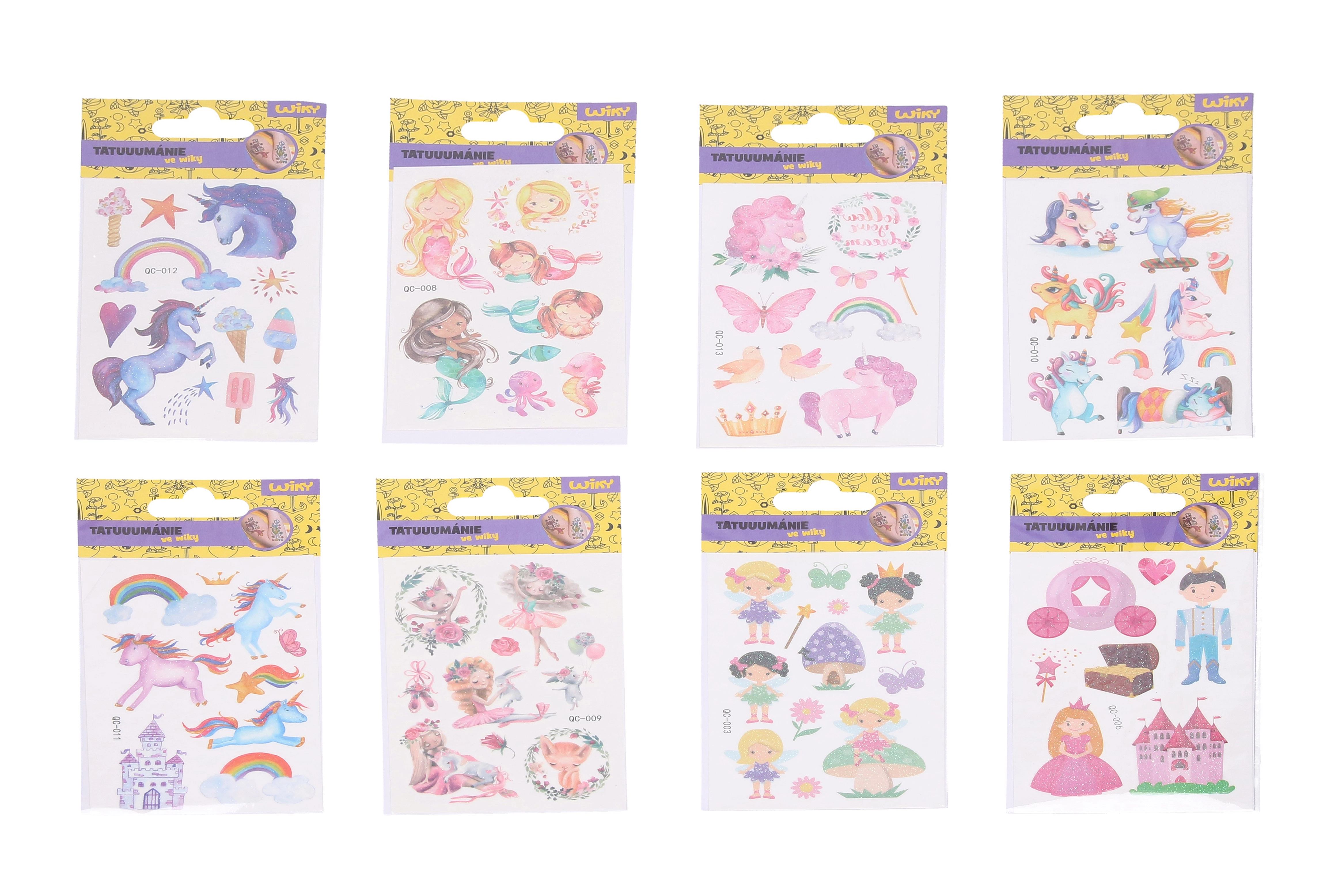 Oživte svůj styl dočasnými tetovacími obtisky ve velikosti 7,5 × 11 cm. Bohatý mix motivů nadchne milovníky pohádkových a přírodních témat – od něžných víl a mořských panen až po roztomilé jednorožce a elegantní motýly. Obtisky se snadno nanášejí a z kůže se postupně smývají.