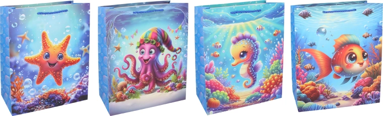 Stylová dárková taška ve velikosti L potěší každého malého oslavence. Nabízí praktické rozměry 30 × 42 × 12 cm, pevné provedení a dětské motivy ve 4 variantách – ideální pro balení větších dárků.