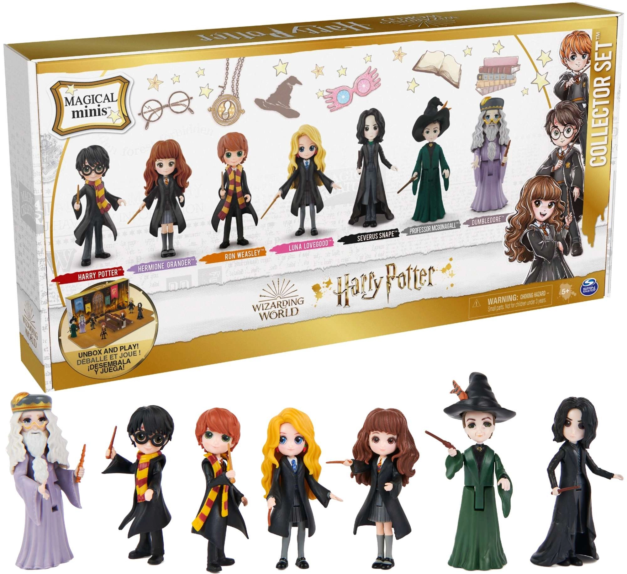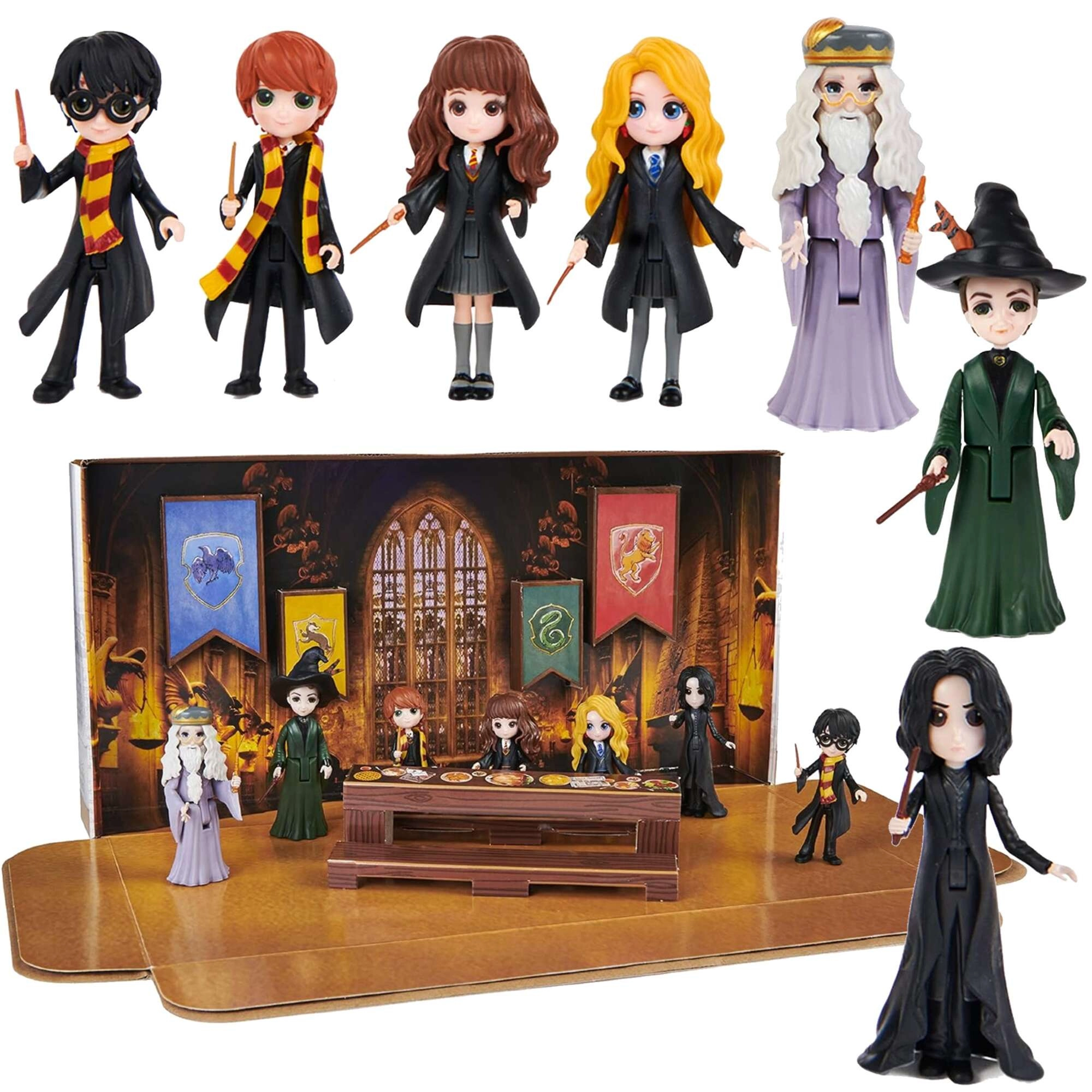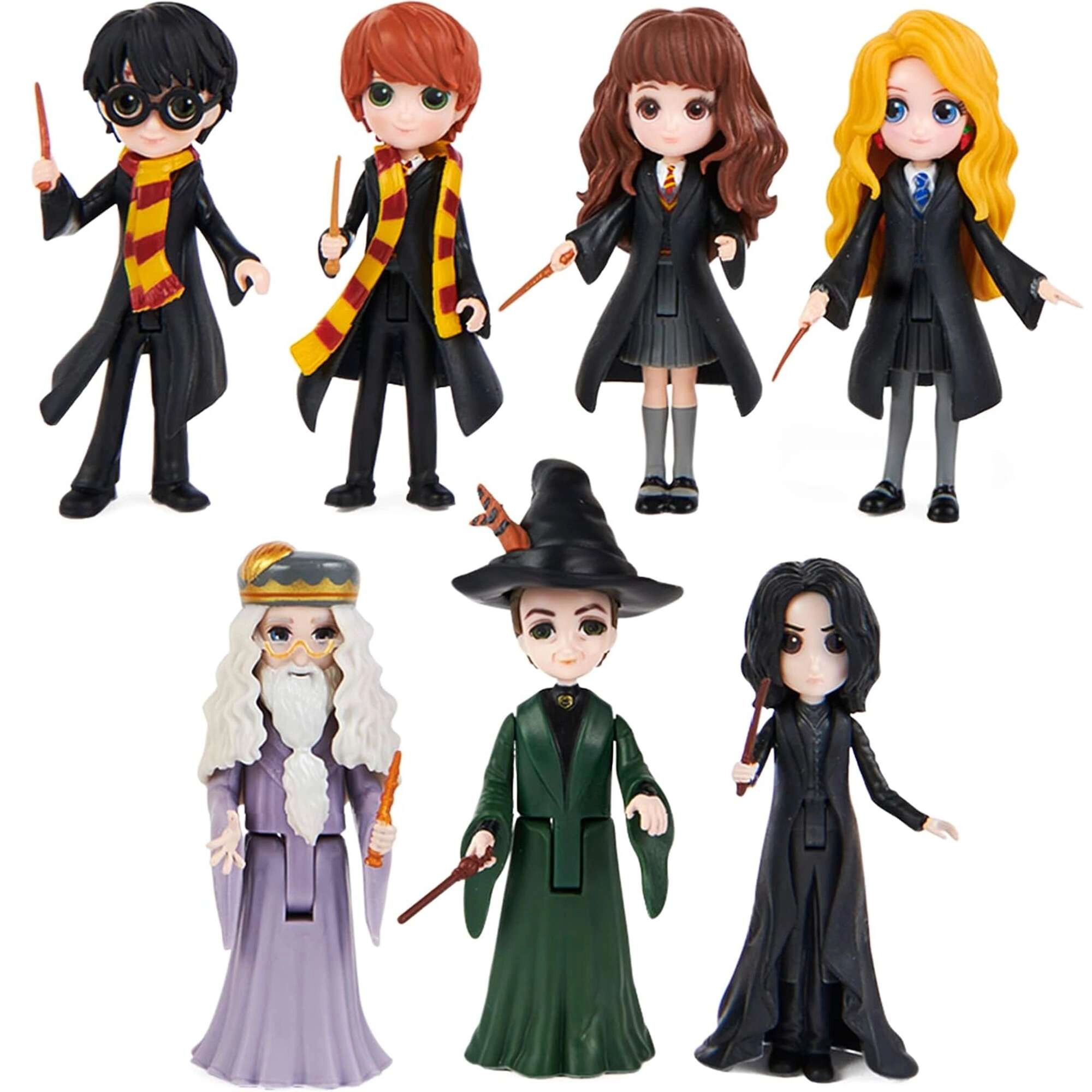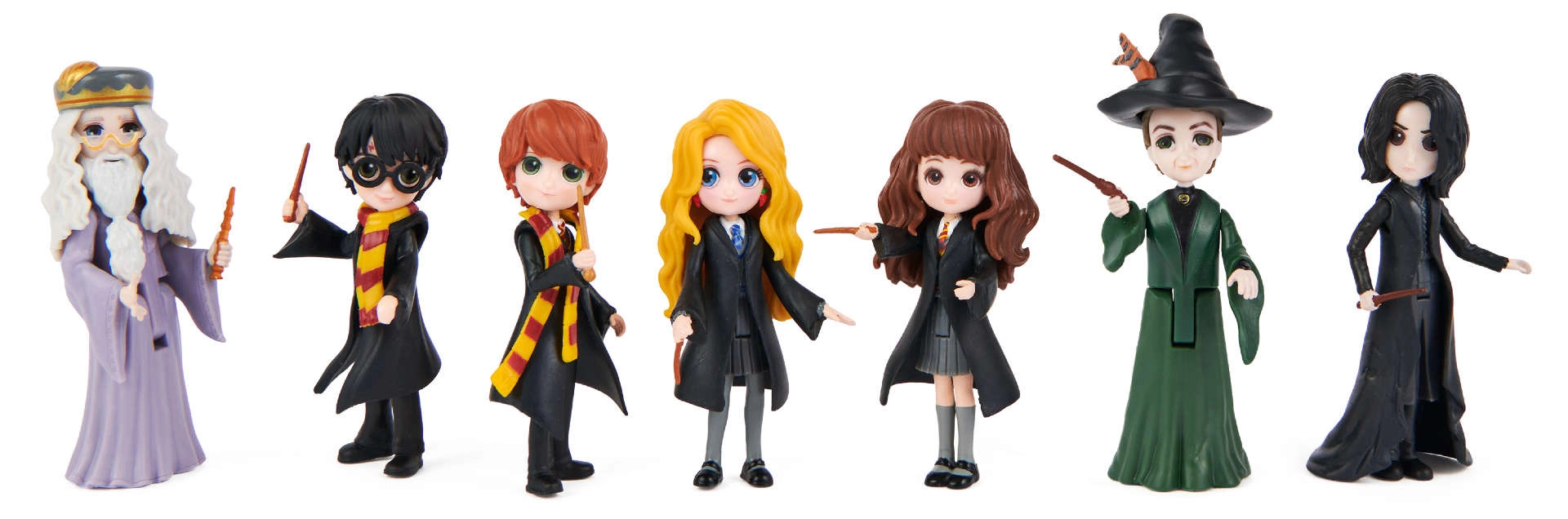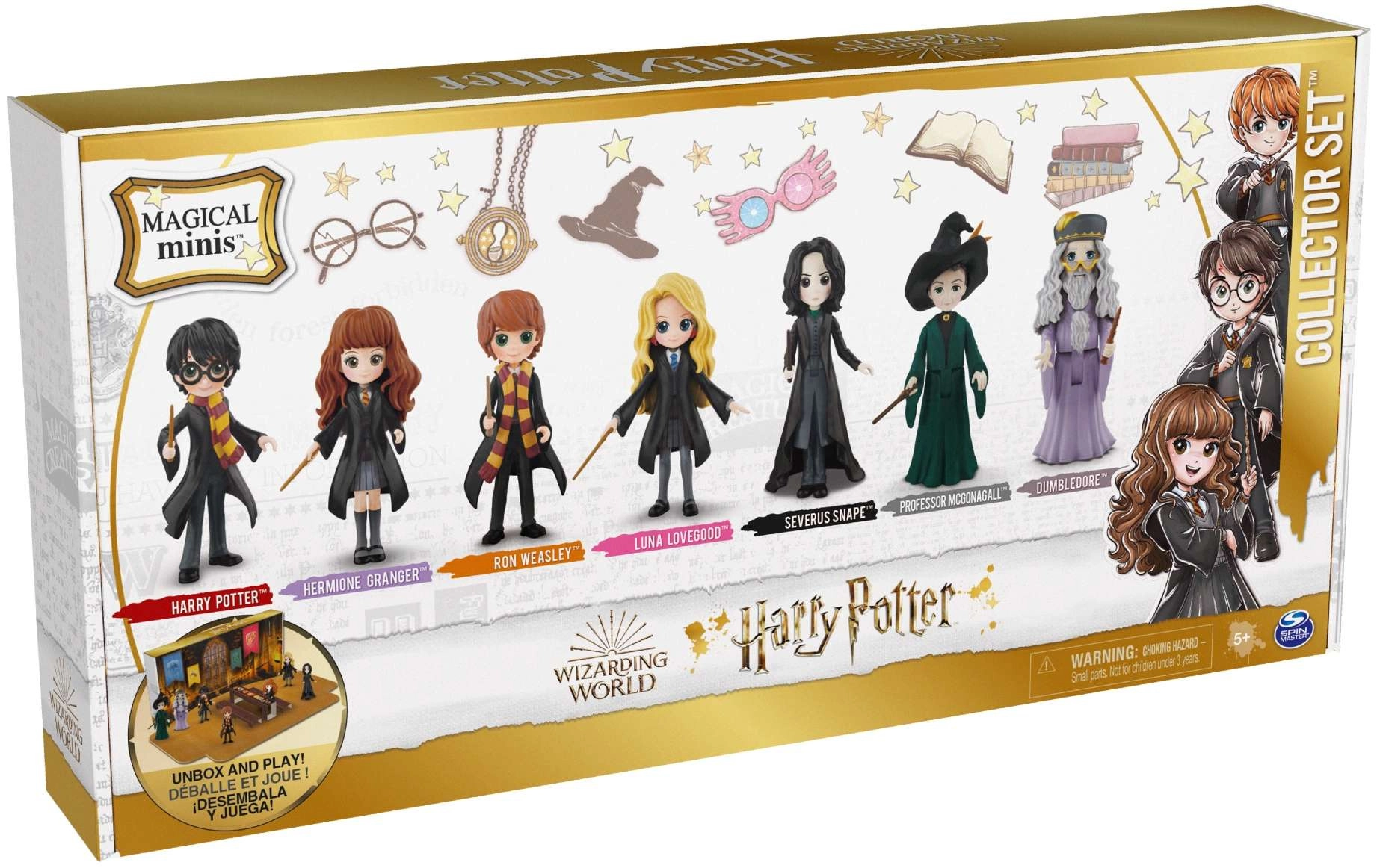 Kompletní parta hrdinů i učitelů z HARRY POTTER: Harry, Hermiona, Ron, Luna, Snape, McGonagallová a Dumbledore – připraveni na příběhy a vystavení.