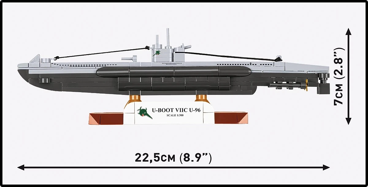 Součástí je pevný podstavec s popisem U-BOOT VIIC U-96, který zvýrazní váš model a zajistí stabilitu při prezentaci.