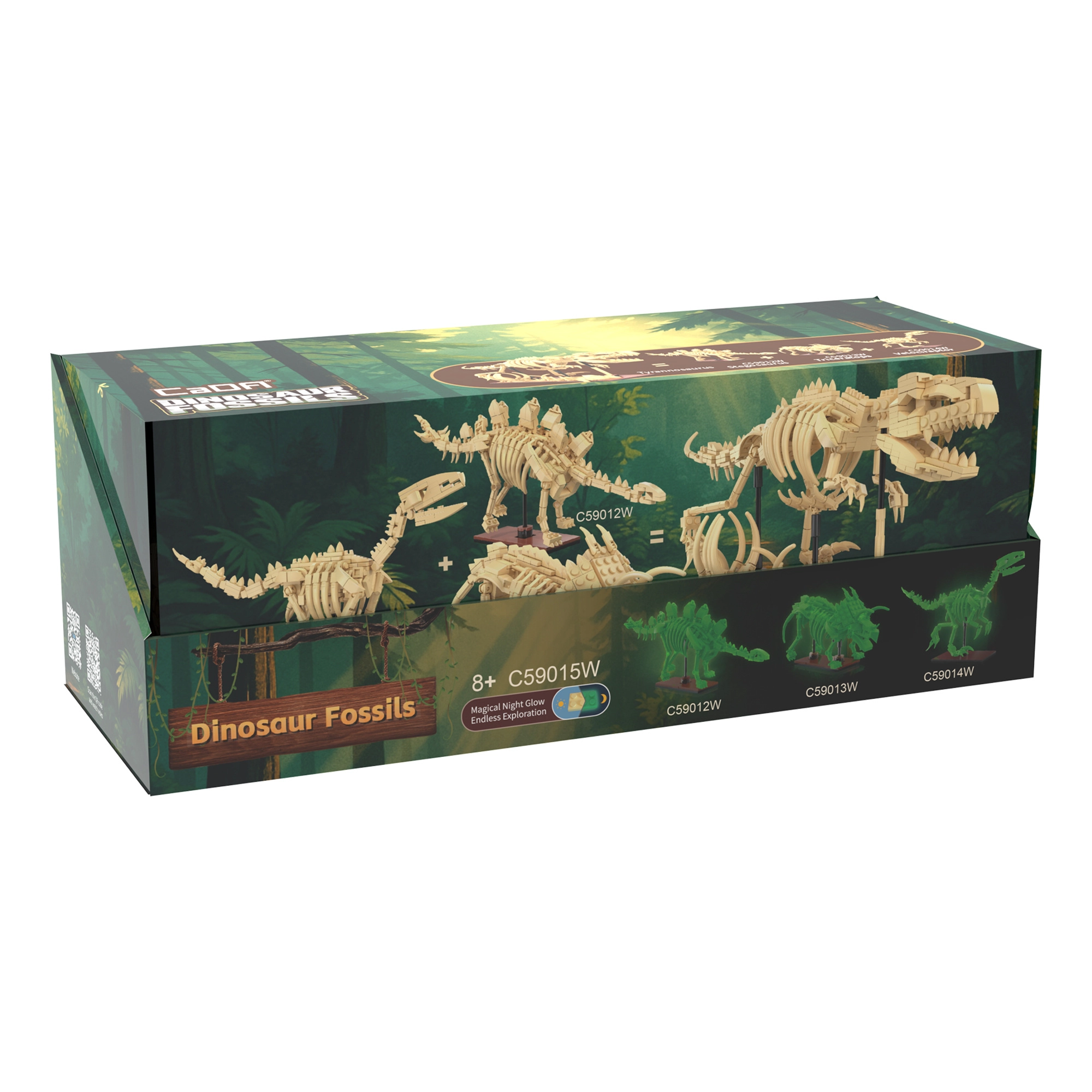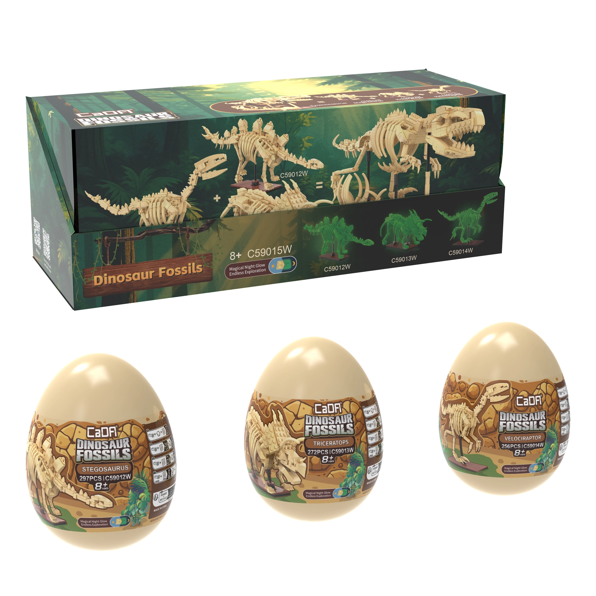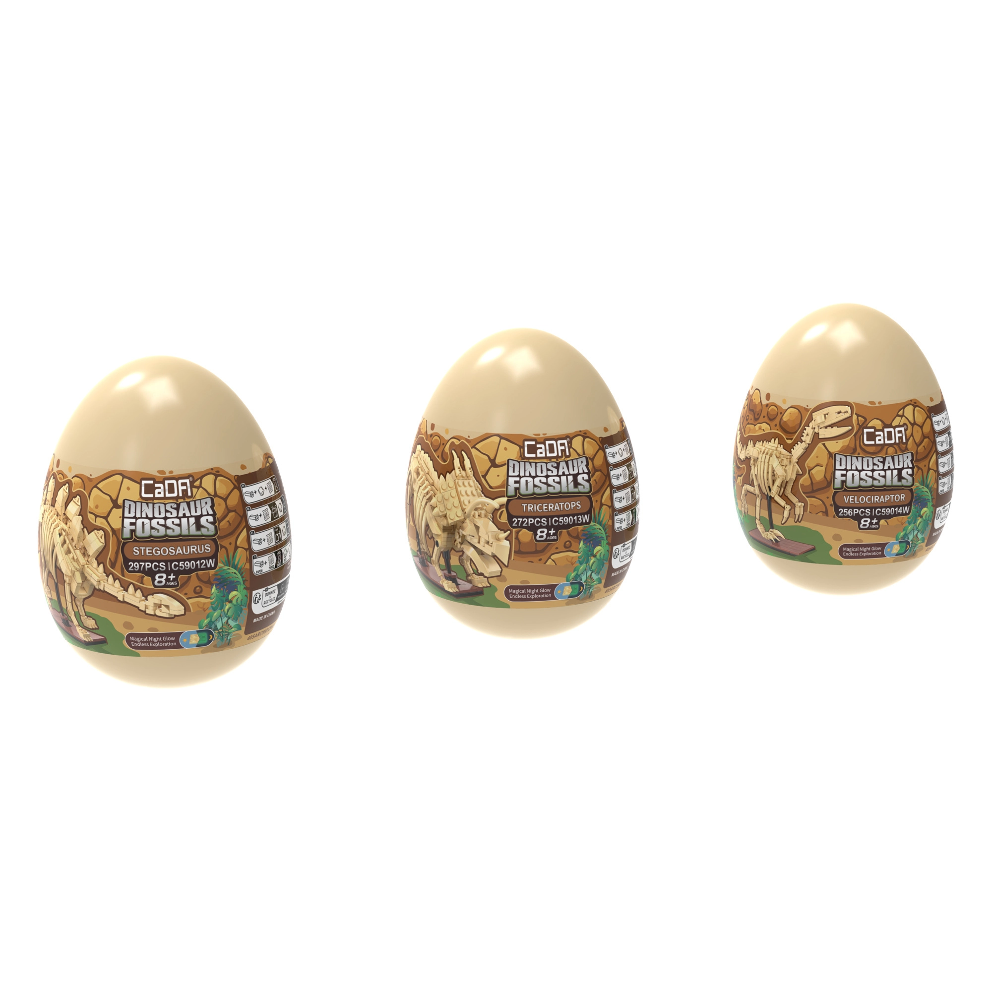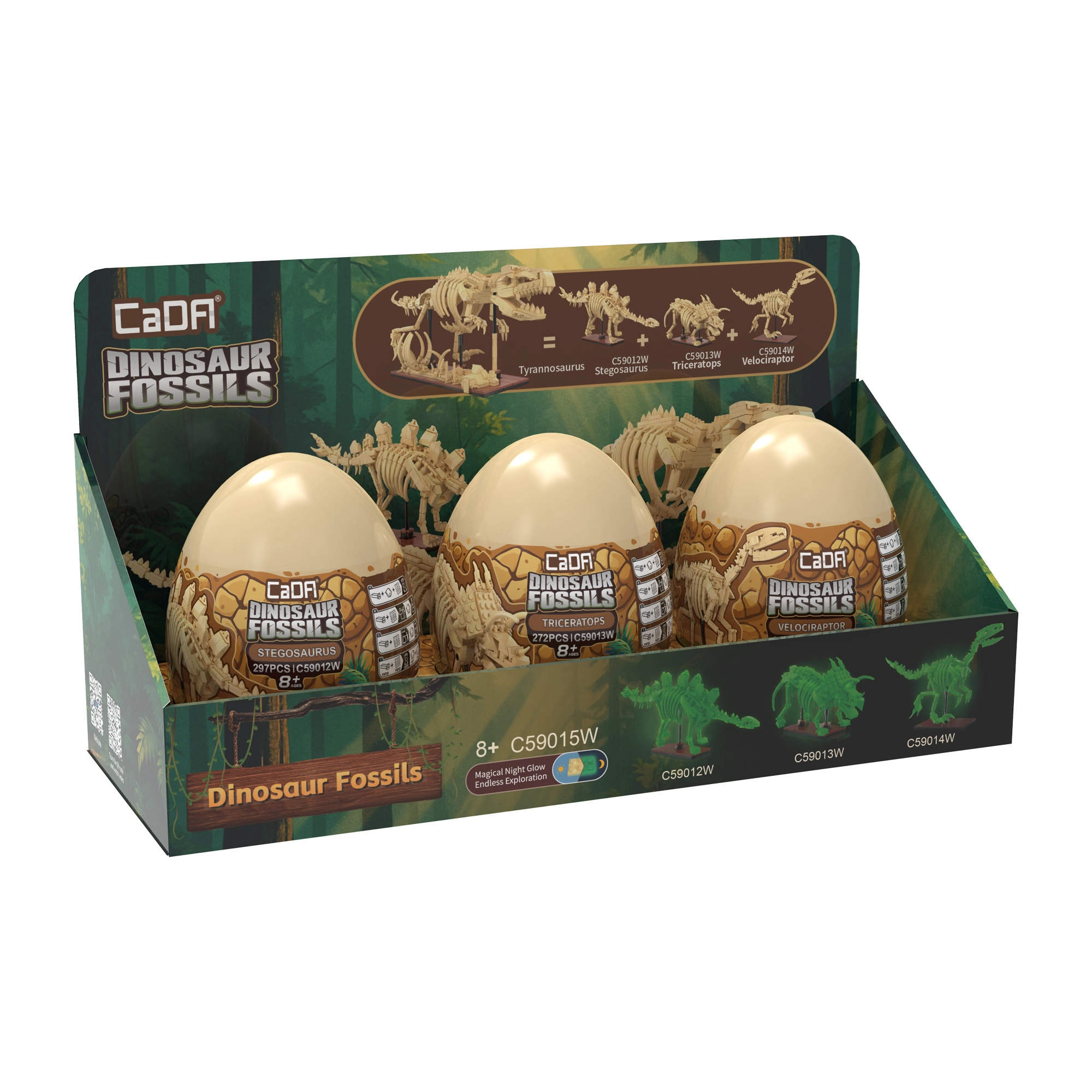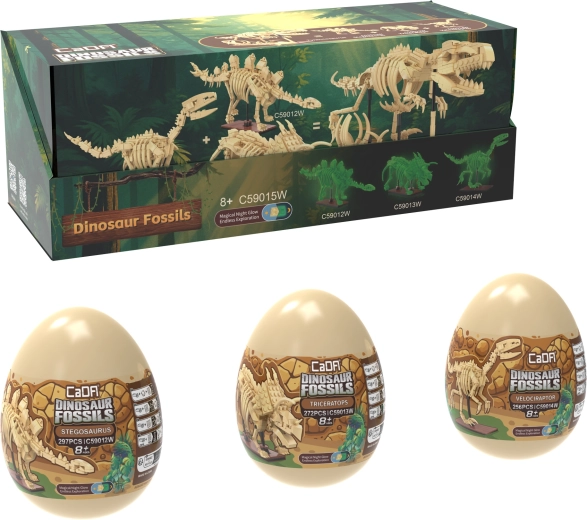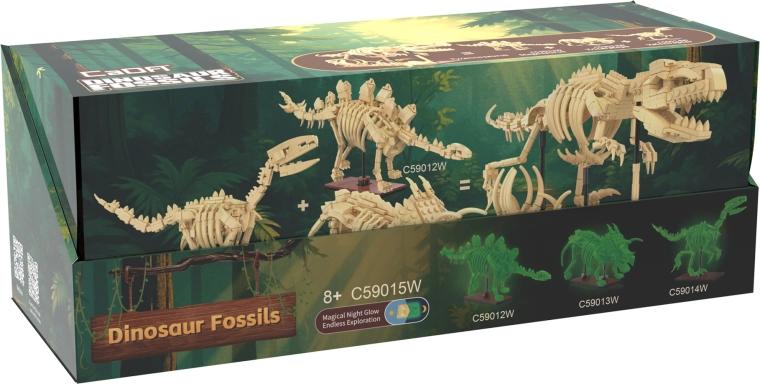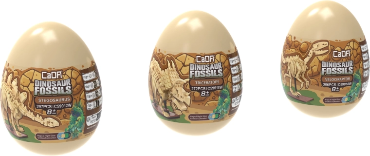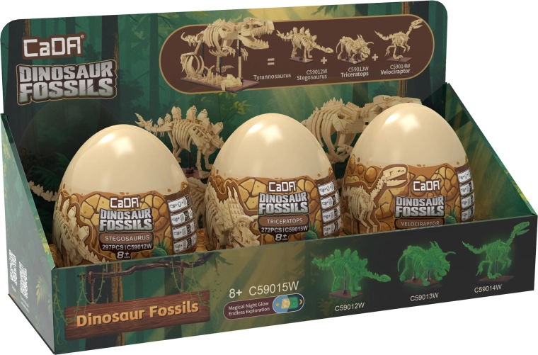 Objevte fascinující svět dinosaurů se stavebnicí CaDA Dinosaur Fossils. Postavte tři detailní kosterní modely – Triceratopse, Stegosaura a Velociraptora – a následně je spojte do impozantního TYRANNOSAURA REXE. Díly mají svítící efekt ve tmě, klouby jsou pohyblivé a set obsahuje celkem 825 kompatibilních dílků v praktických sběratelských „vejcích“.