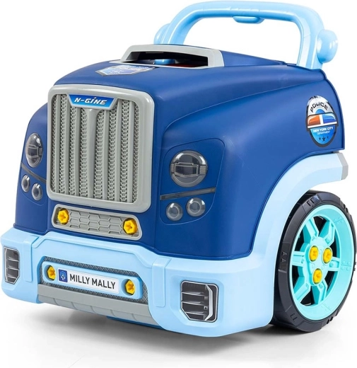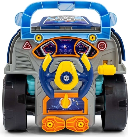 Součástí je 56 dílků, volant s klaksonem, odnímatelná kolečka, úložný prostor na nářadí a dekorativní nálepky (včetně registračních). Hračka je vhodná pro děti od 3 let a rozvíjí jemnou motoriku, koordinaci oko–ruka i technické myšlení.