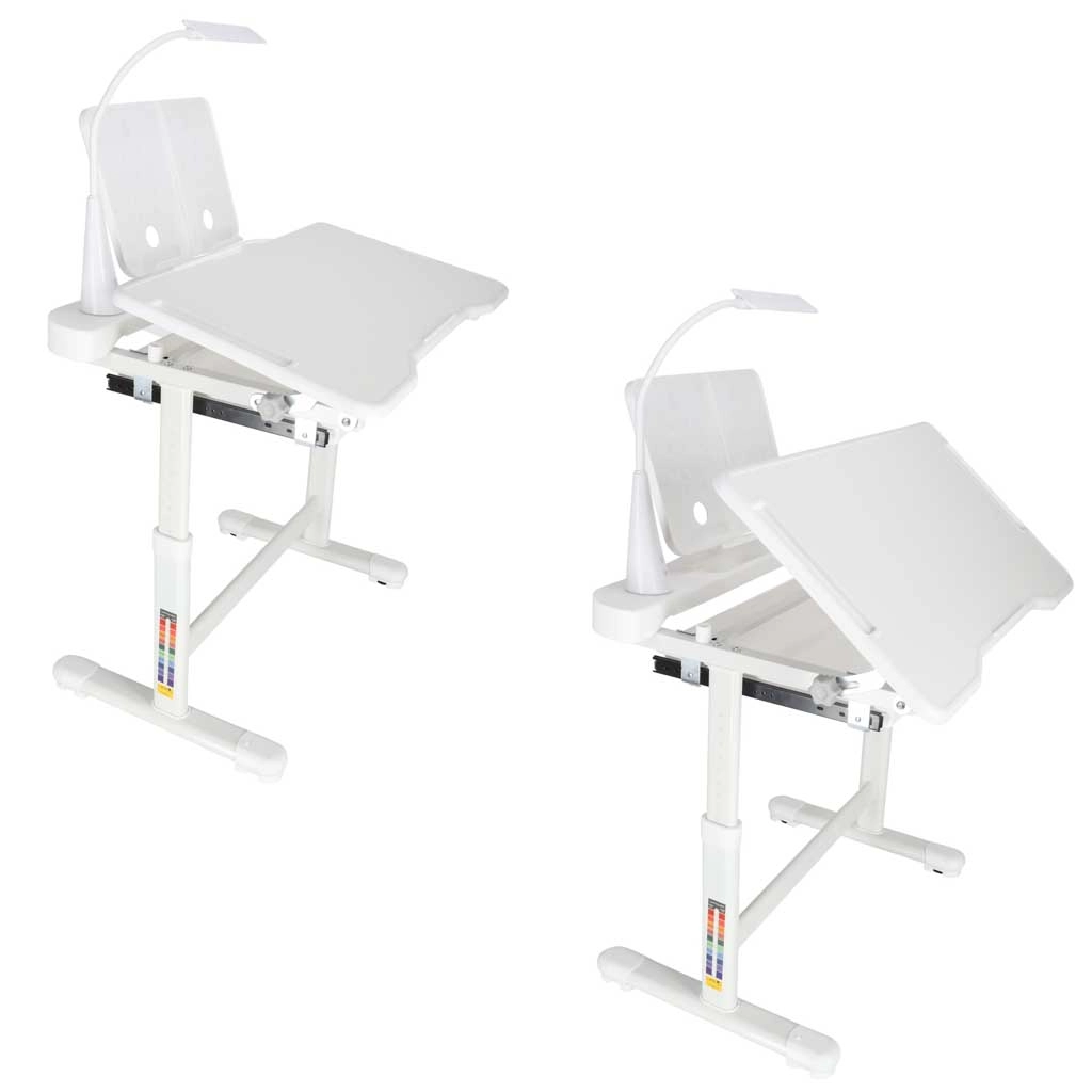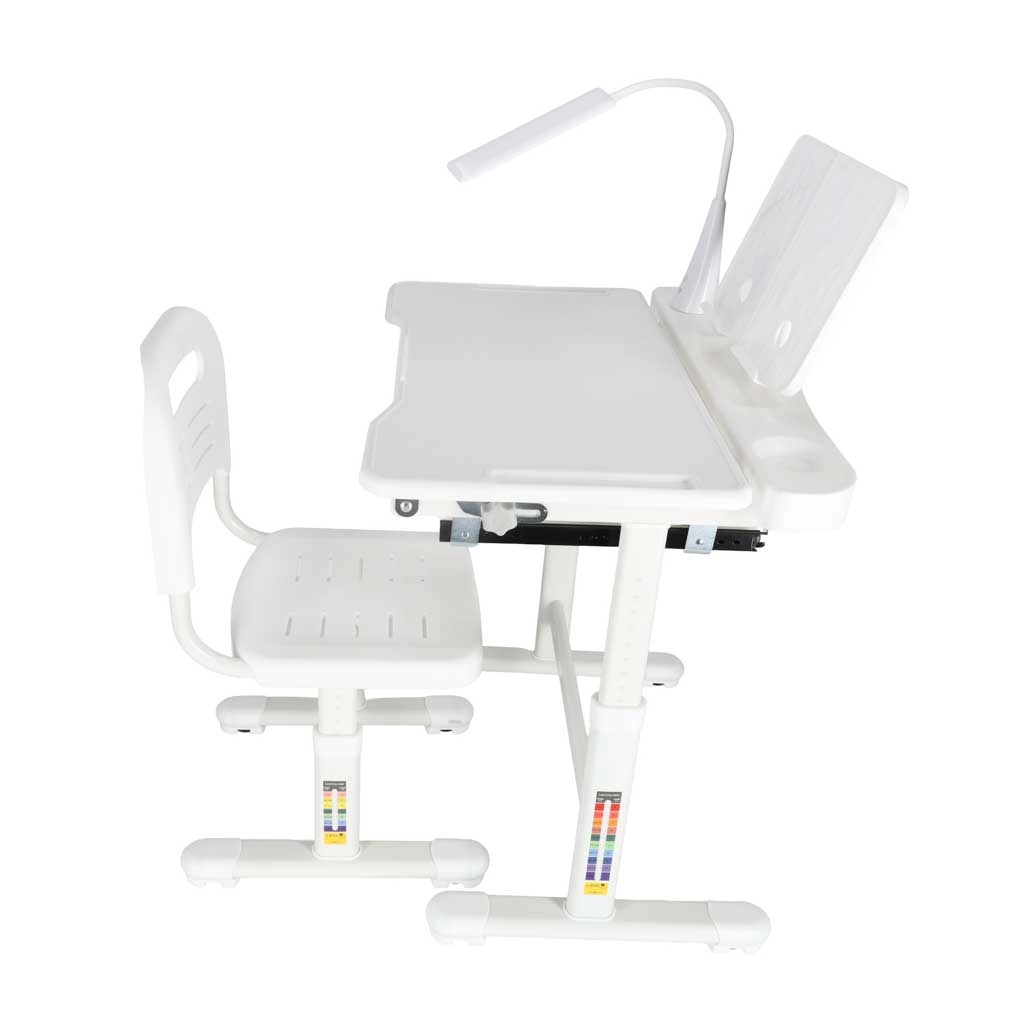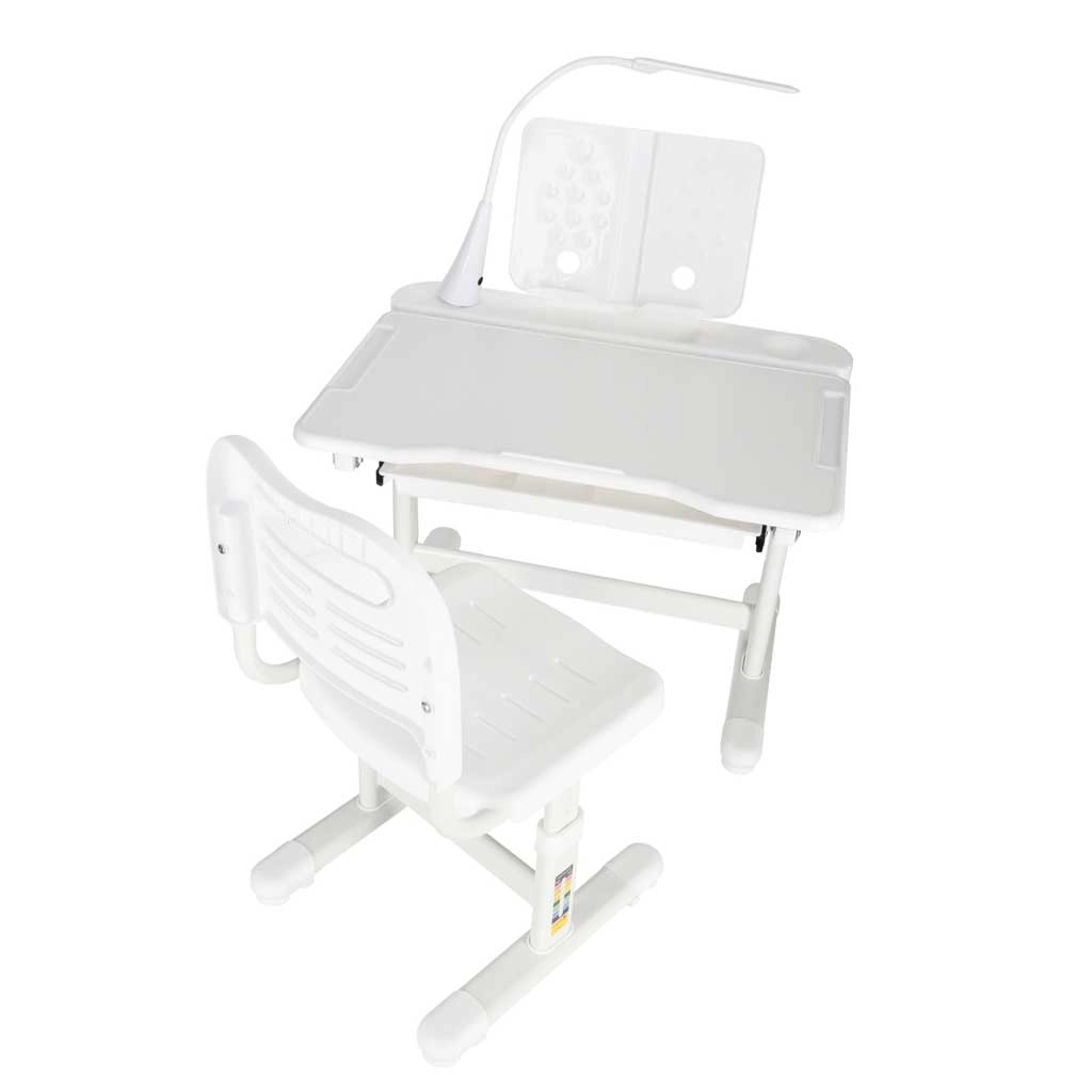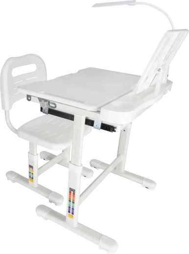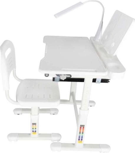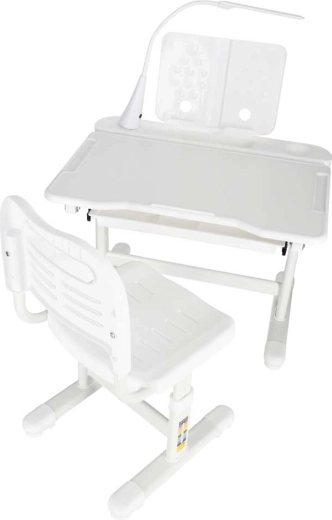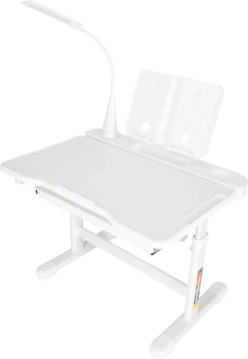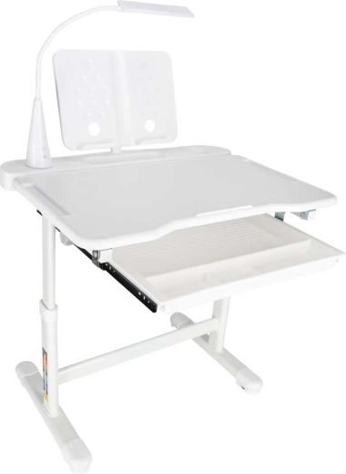 Integrovaná LED lampička napájená přes USB nabízí 3 barvy světla (teplá, studená, smíšená) a 3 úrovně jasu pro ideální osvětlení v každou denní dobu. Široká výsuvná zásuvka s přihrádkami a stojánek na knihu/tablet udrží pomůcky přehledné a po ruce. Bezpečné zaoblené hrany a pevná rámová konstrukce z kovu, MDF a plastu zajišťují stabilitu a dlouhou životnost.