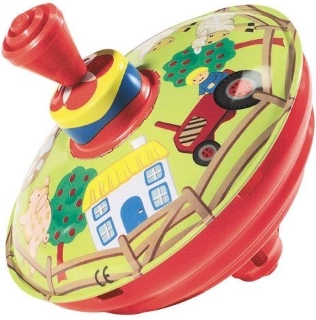 Tato tradiční hrací káča s motivem selského dvora je ideální hračkou pro nejmenší. Jednoduchý mechanismus stlačení páčky roztočí káču, která se při točení postará o charakteristický zvuk a vizuální podněty.