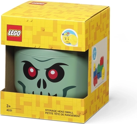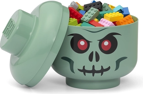 Tato zelená LEGO úložná hlava (velikost S) je ideální pro skladování LEGO kostek, menších hraček či sladkostí. Díky výraznému potisku kostlivecké tváře se stane hravou dekorací dětského pokoje i praktickým organizérem.