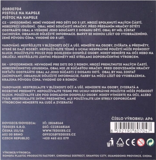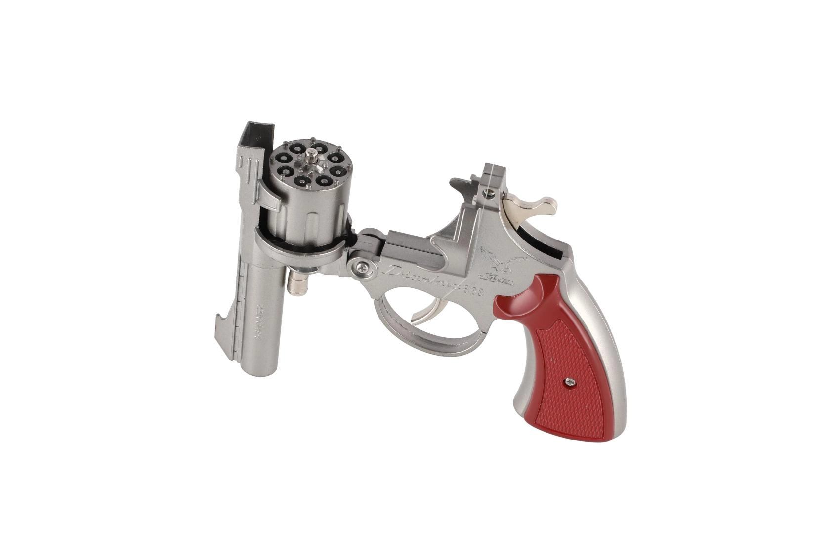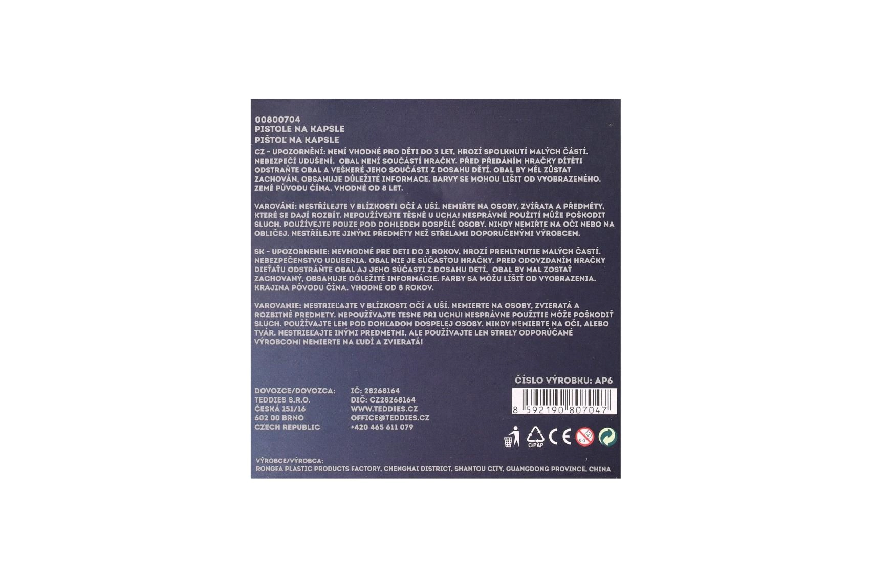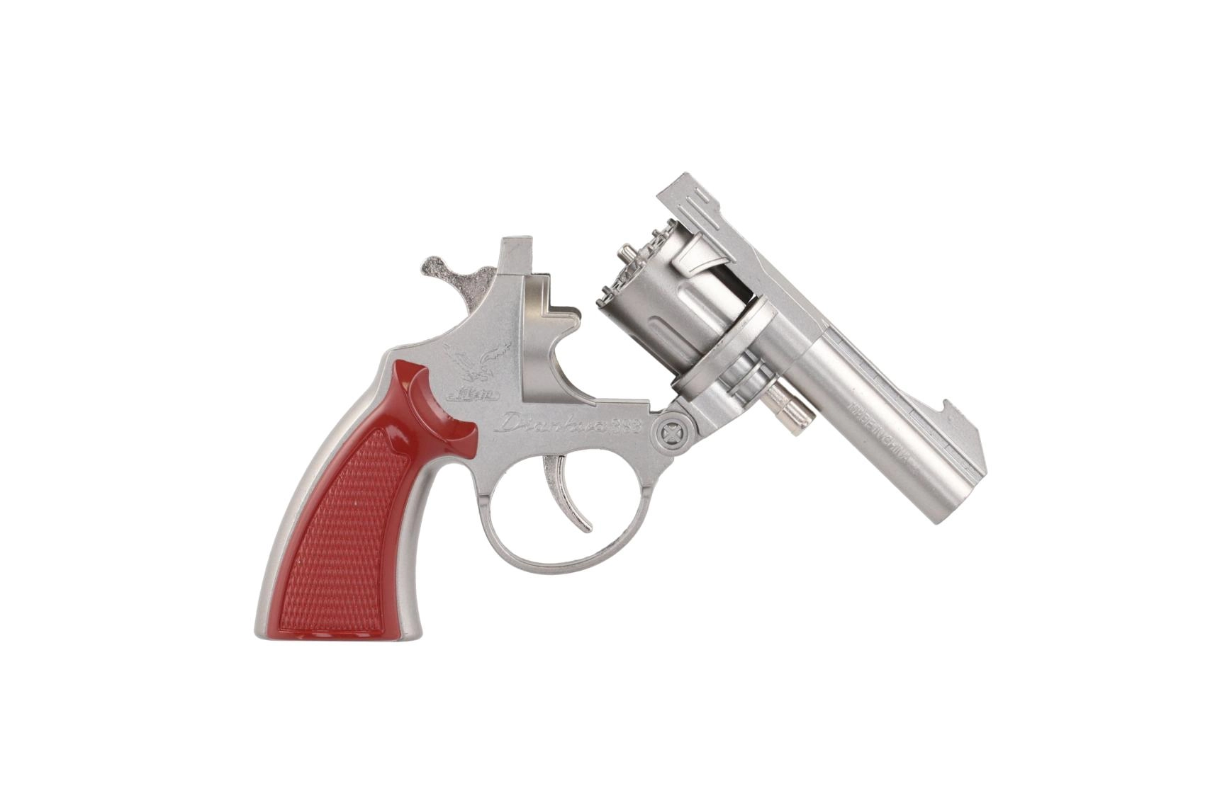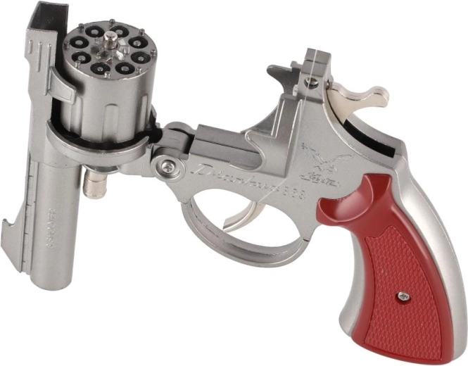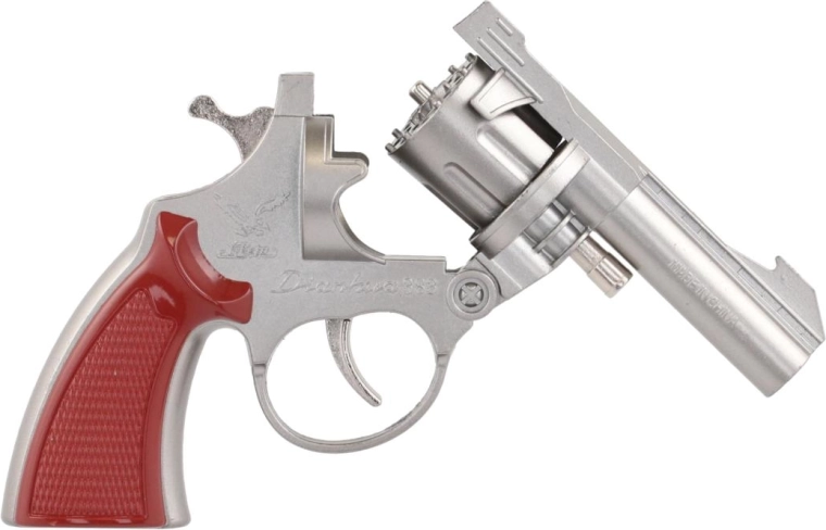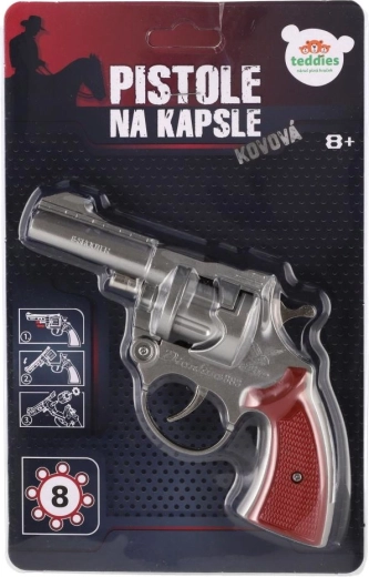 Tato kovová pistole na kapsle nabízí autentický pocit ze hry bez rizika. Bubínek je určen pro kapsle s 8 ranami, které po zmáčknutí spouště vydávají zvukový efekt. Robustní kovové provedení a pohodlná rukojeť zajišťují dlouhou životnost i komfort při držení.
