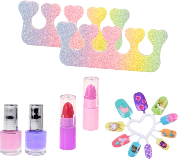 Kompletní sada obsahuje rtěnky, oční stíny, laky, samolepky, tipy, separátory a další doplňky – připravené k okamžité zábavě.