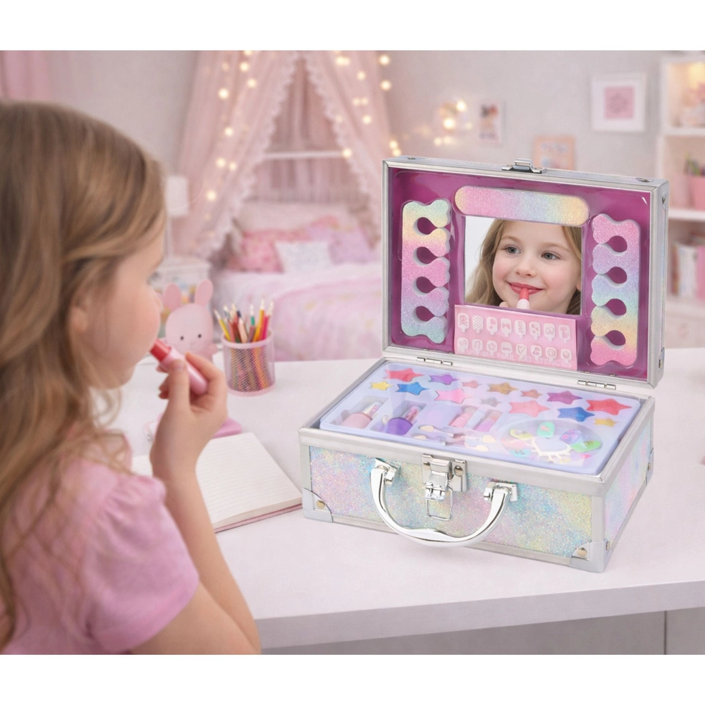 Stylový dětský kufřík v třpytivém provedení je ideální pro malé milovnice líčení. Uvnitř najdou vše potřebné pro hru na vizážistku – od lesků a stínů na oči až po laky, samolepky a dětské tipy na nehty. Vestavěné zrcátko promění kufřík v praktickou mini toaletku a umožní pohodlné líčení i na cestách.