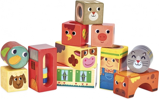 Představujeme vám Vilac Dřevěné zvukové kostky Farma, skvělou hračku pro malé průzkumníky. Tento set obsahuje jedenáct dřevěných kostek, každá s různými motivy farmy, které při otáčení a třesení vydávají různé zvuky.