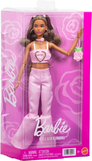 Tato módní panenka přináší svěží fashion styl inspirovaný nejnovějšími trendy. Outfit tvoří krátký top se srdíčkem a dlouhé kalhoty do zvonu s růžovým vzorem. Look doplňuje růžová kabelka ve tvaru růže, náhrdelník s motivem růže a výrazné náušnice – vše sladěné do jednotné, efektní stylizace.