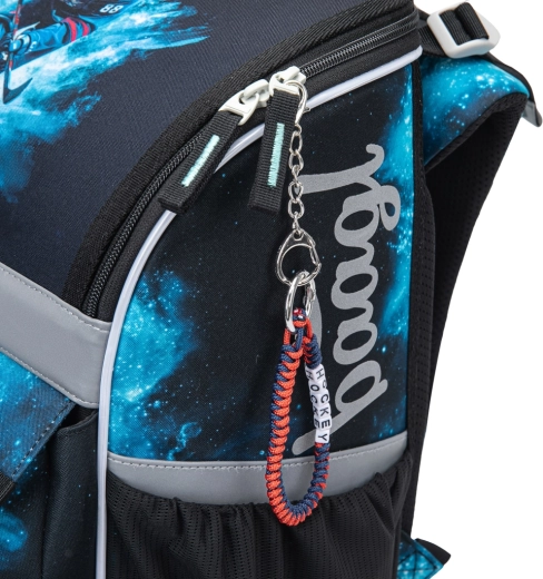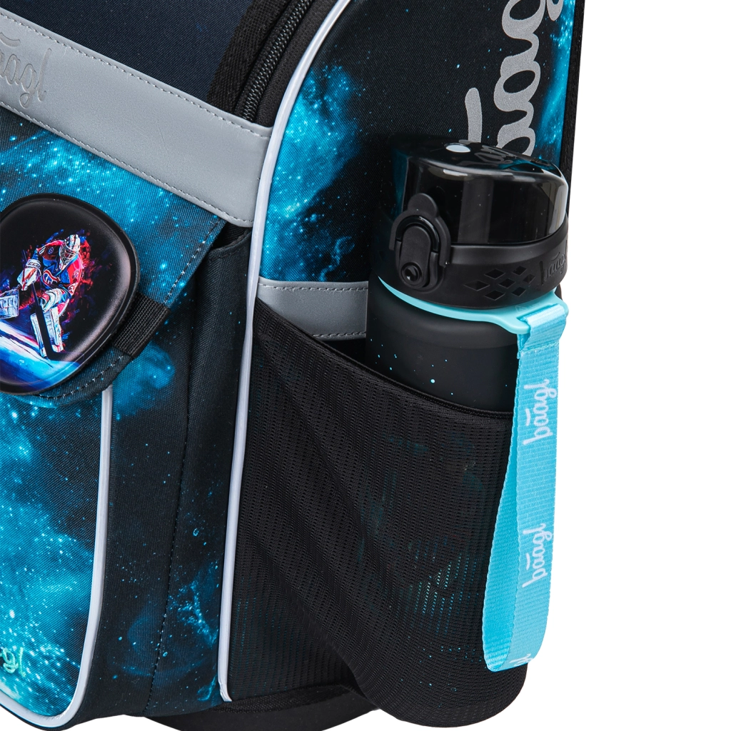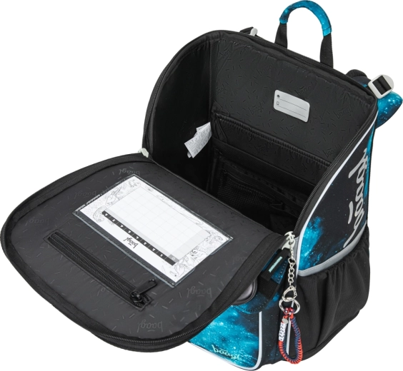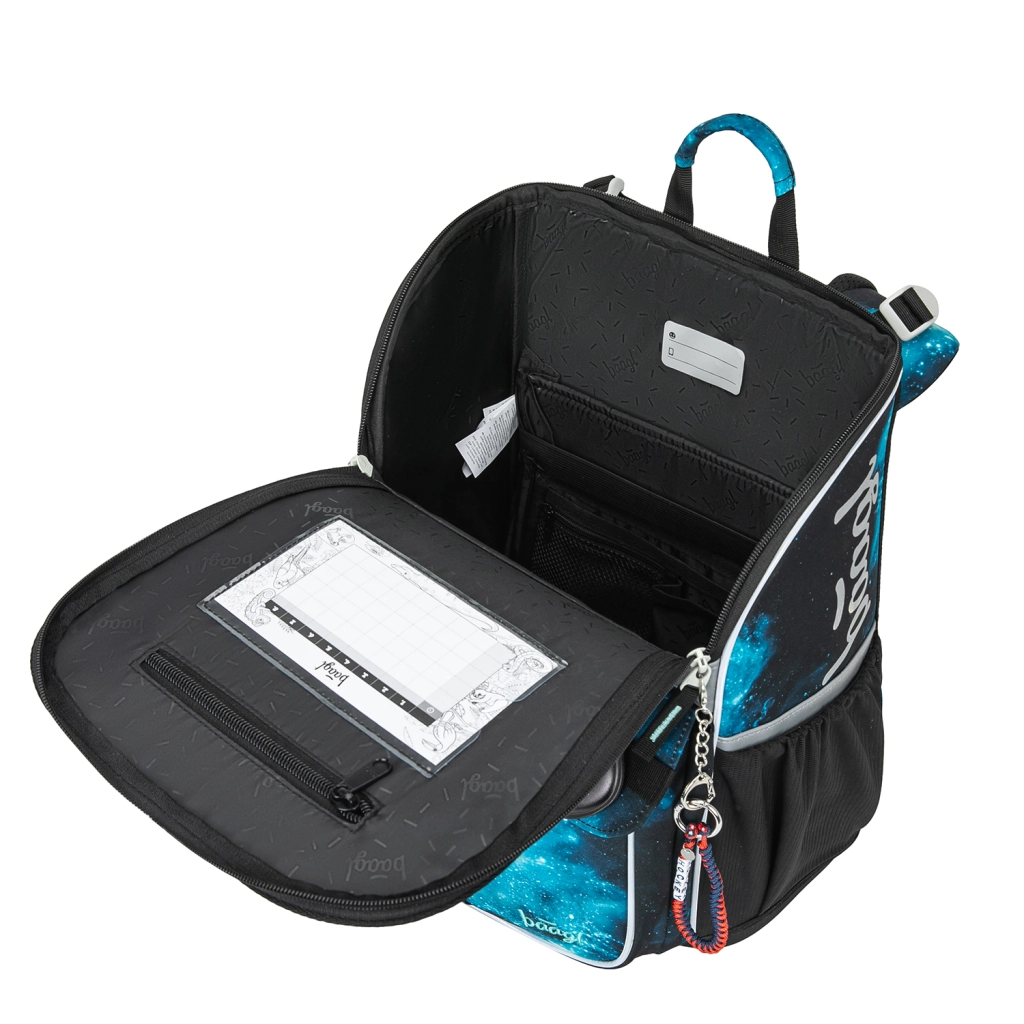 Chytrý vyklápěcí systém otevírání umožňuje snadný přístup k sešitům přímo z lavice. Uvnitř najdete fixační gumičku pro udržení těžiště blízko zad a přehledné členění. Boční kapsy z pevného materiálu jsou ideální pro láhev na pití. Reflexní prvky zvyšují bezpečnost při horší viditelnosti.