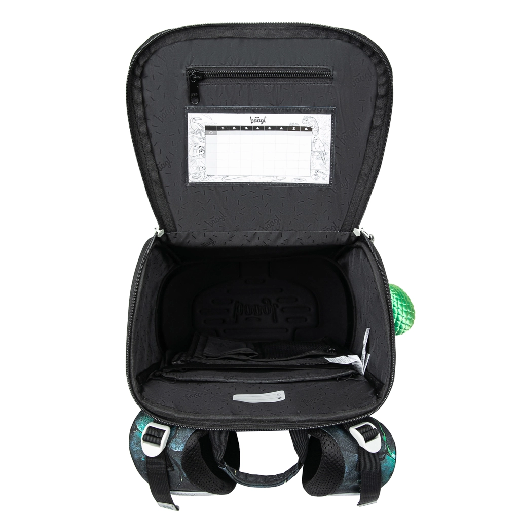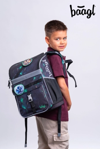 Set doplňuje prostorný penál se dvěma chlopněmi (bez náplně) s kapsičkou a okénkem na rozvrh, omyvatelný vak na záda se zipovou kapsou, praktická dětská zástěra na výtvarnou výchovu a peněženka na krk pro bezpečné uložení drobností. Vše sjednocené v atraktivním dračím designu pro malé dobrodruhy.