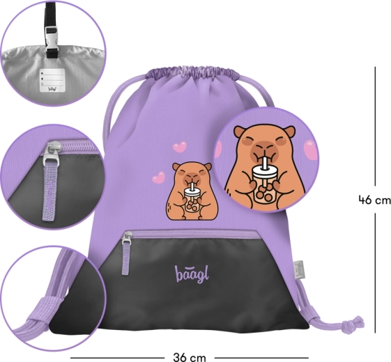 Praktický vak na záda Baagl s motivem Kapybara je ideální do školy i na volný čas. Nabízí prostornou hlavní část, přední kapsu na zip pro drobnosti a pevné tkanice pro pohodlné nošení. Je vyroben z odolného, omyvatelného materiálu a díky poutku s přezkou ho snadno připnete k batohu či aktovce.