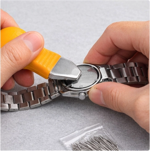 Rozsáhlá sada nástrojů pro otevírání víček, zkracování náramků, výměnu stěžejek a precizní manipulaci s díly. Praktické pouzdro udržuje vše přehledně uspořádané.