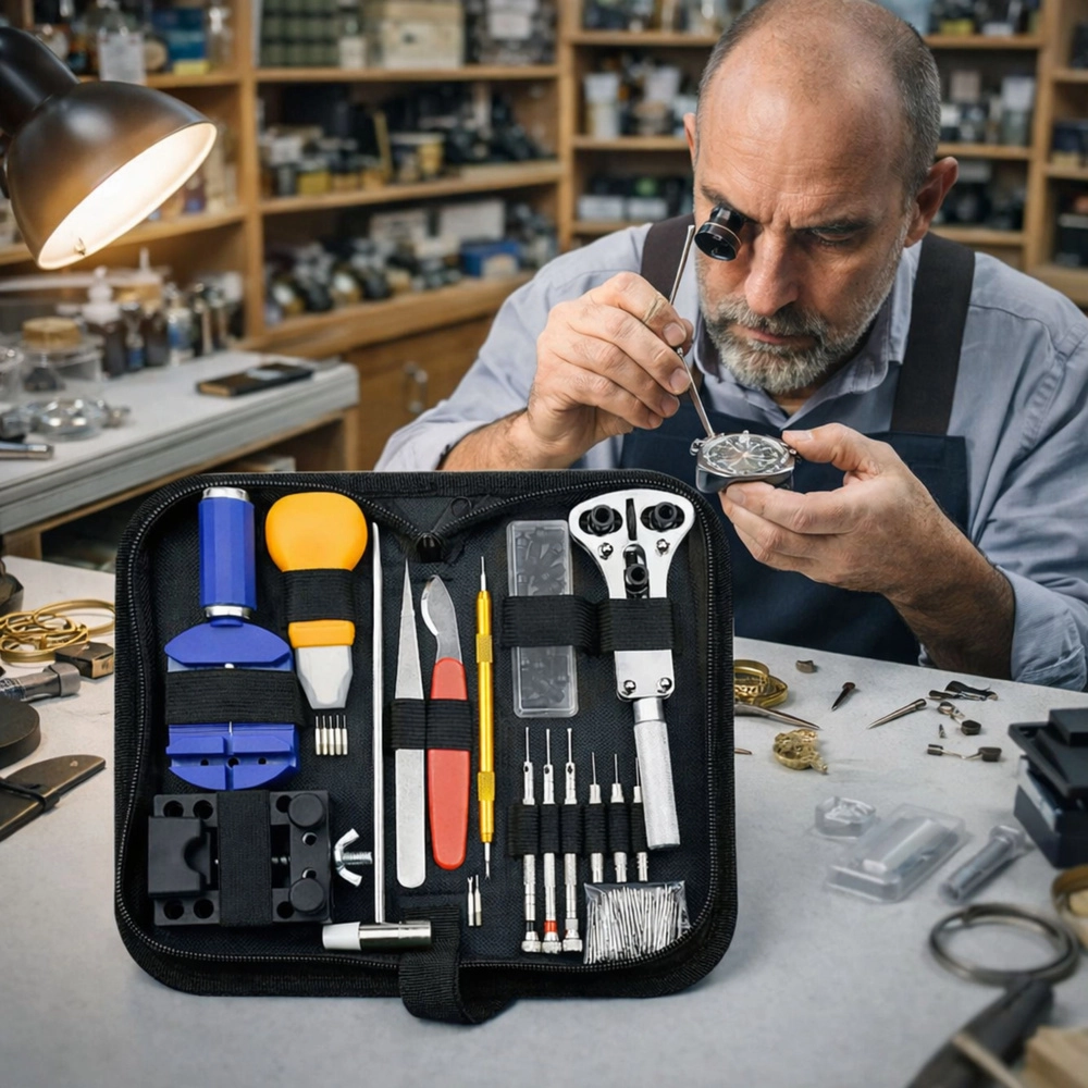 Kompletní sada pro opravu a údržbu hodinek nabízí vše, co potřebujete pro domácí i pokročilé hodinářské práce. Obsahuje nástroje pro otevírání zadních víček, zkracování a regulaci náramků, výměnu stěžejek i bezpečné upnutí hodinek. Kvalitní nástroje z nerezové oceli a hliníku jsou uloženy v praktickém zipovém pouzdře pro snadnou organizaci a přenos.