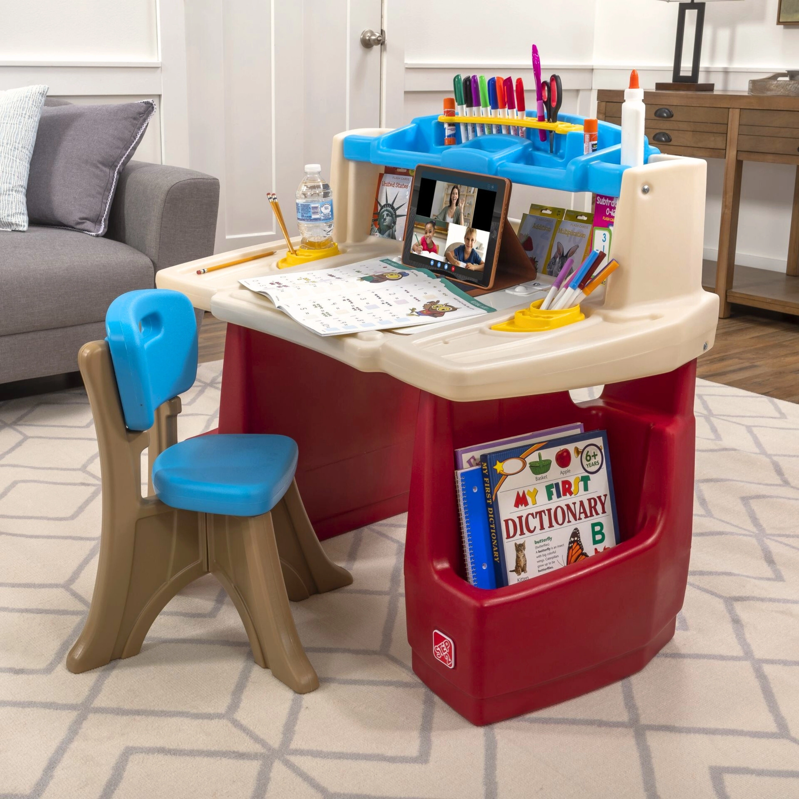 - stůl s výklopnou suchostíratelnou tabulí, židlička, police a úložné nádoby, vestavěná lampička (bez baterií)