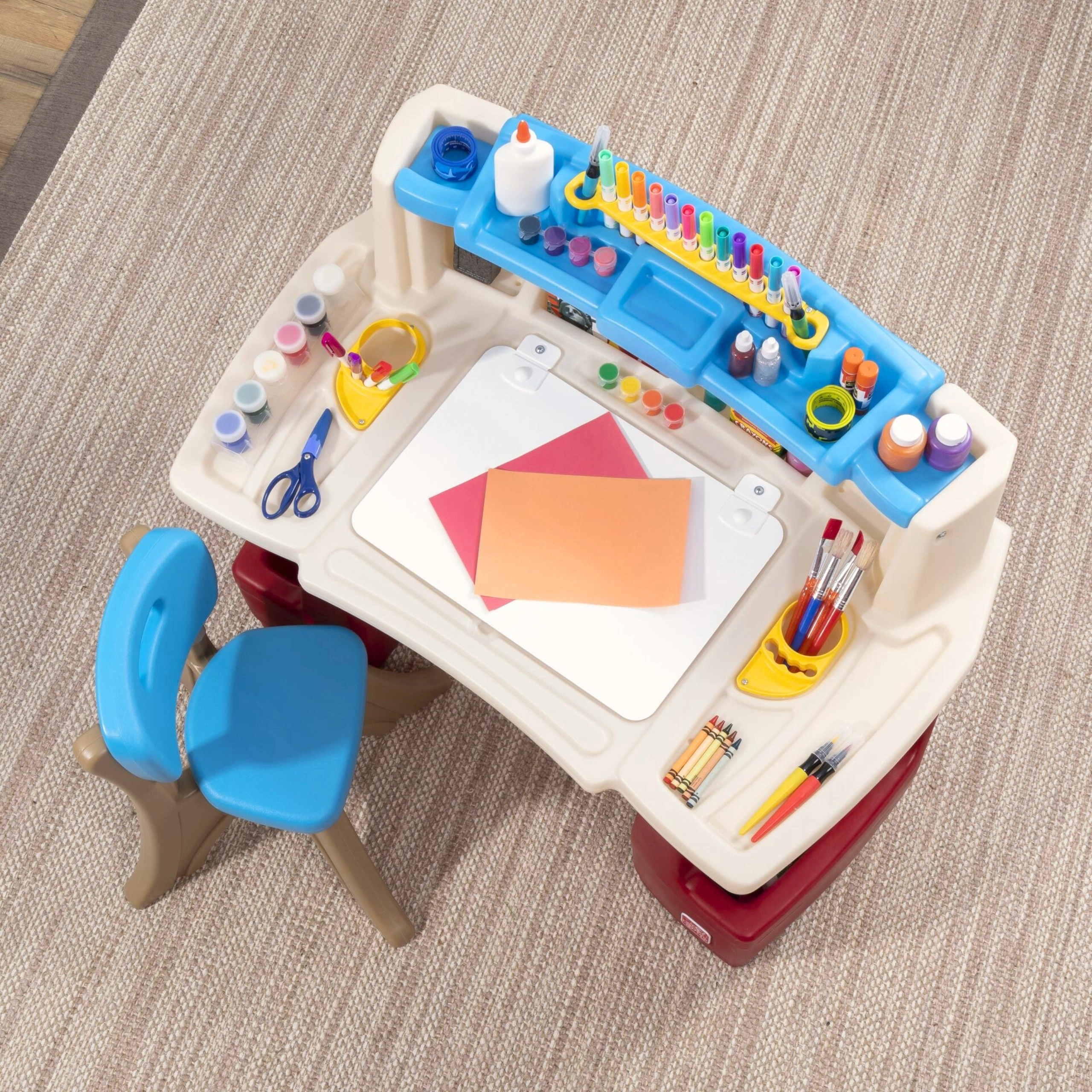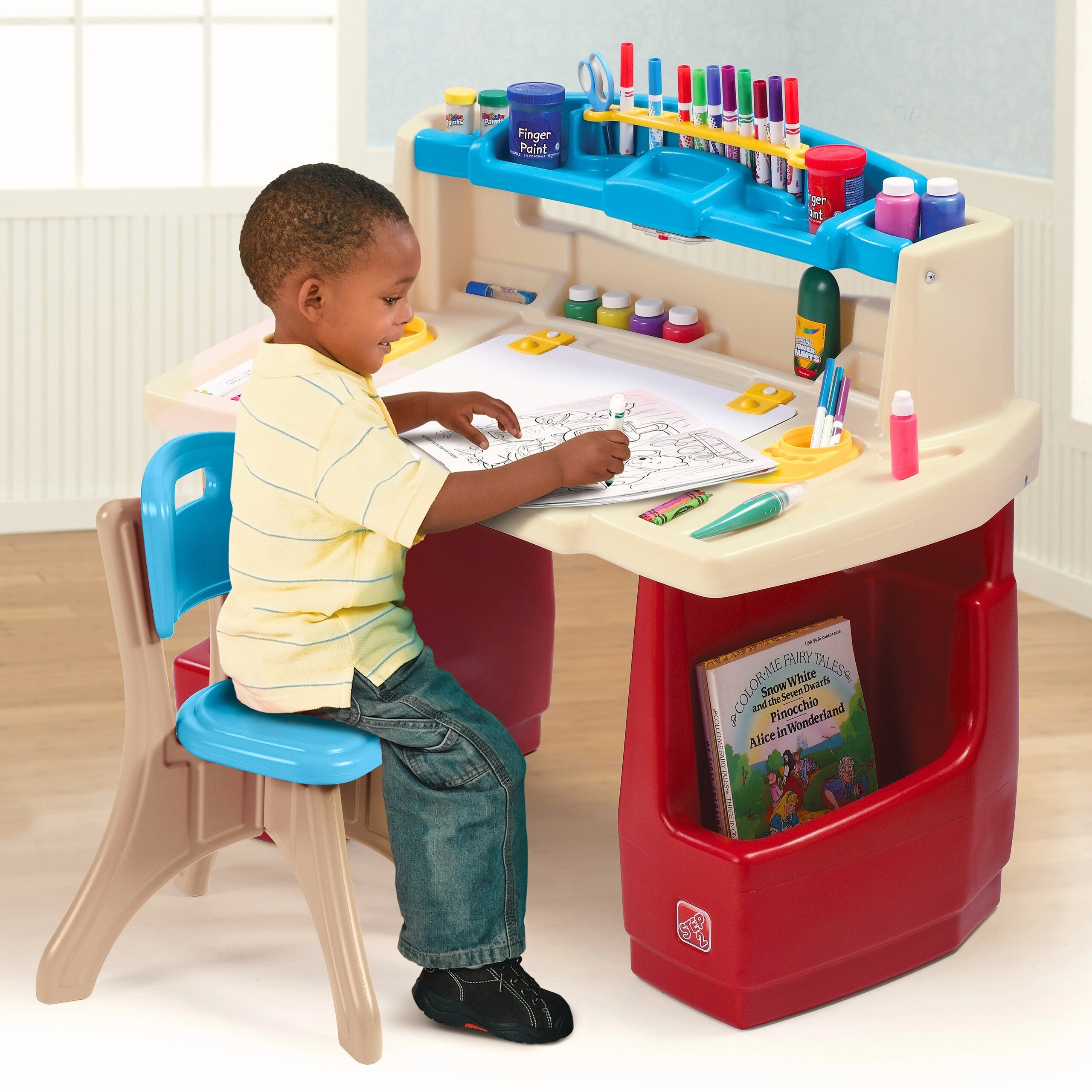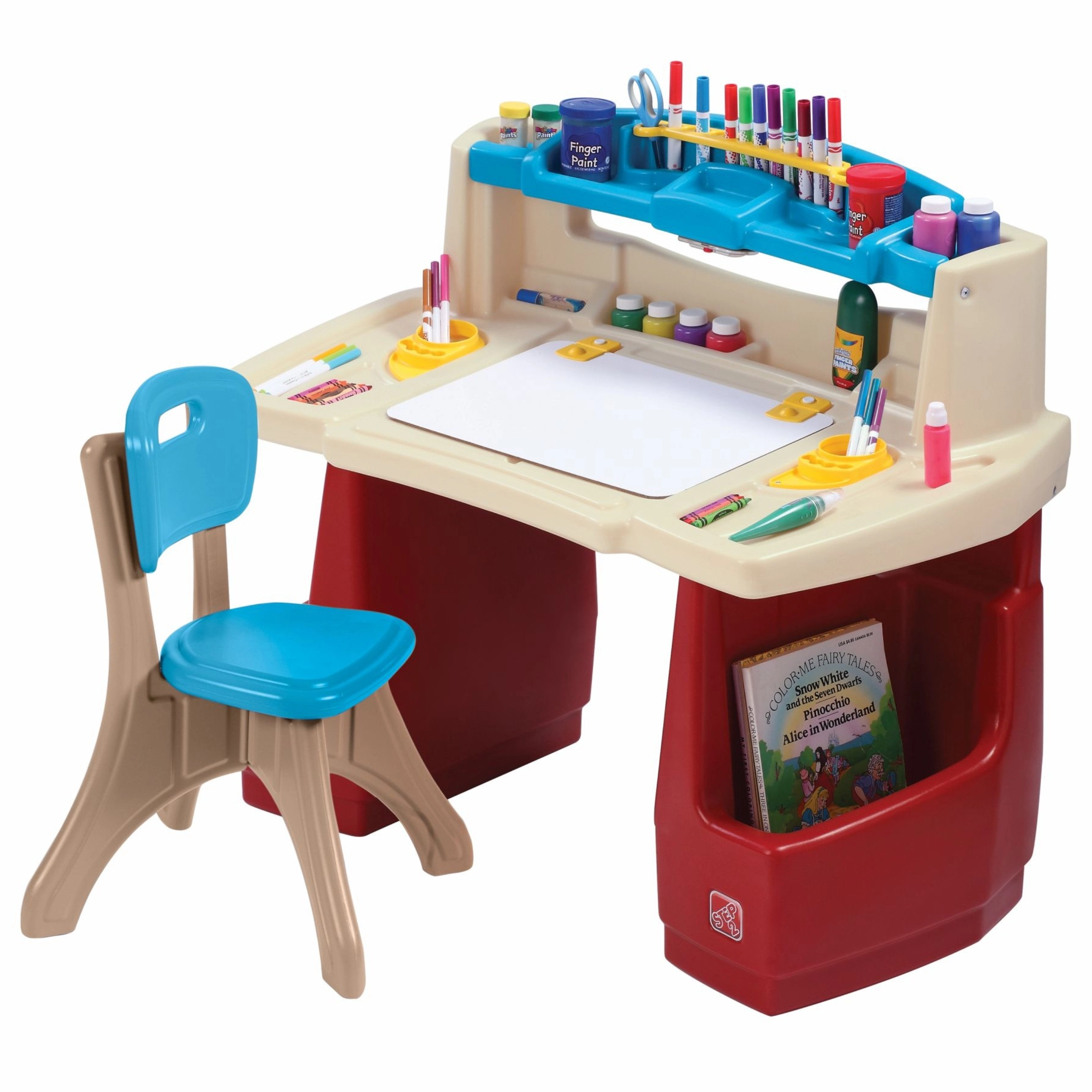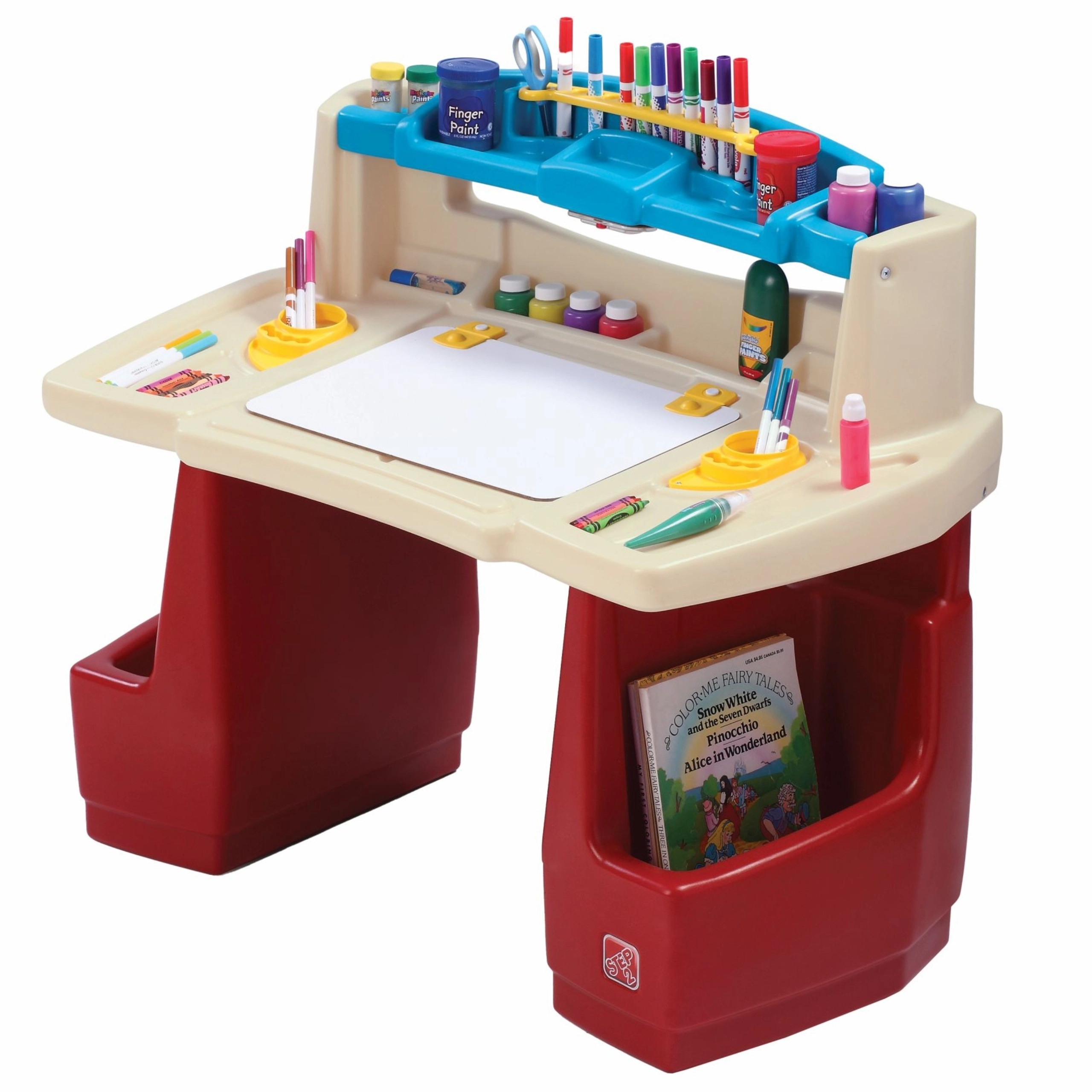 Set STEP2 Deluxe Art Master promění dětský pokoj v inspirativní ateliér. Děti mají k dispozici velký pracovní prostor s výklopnou suchostíratelnou tabulí, která se snadno čistí a ukrývá další místo na pomůcky. Horní organizér, boční koše a svislé přihrádky udrží pastelky, barvy, knihy i tablet vždy po ruce.
