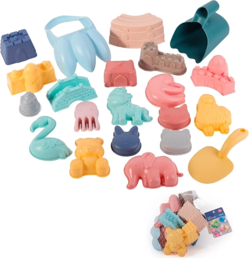 Objevte kreativní zábavu se sadou do písku WOOPIE, která potěší děti svým pastelovým vzhledem a pohodlným, ohebným silikonovým materiálem. Díky 21 dílům si děti postaví hrady, tvary a celé písečné světy – doma na zahradě, v pískovišti i na pláži.