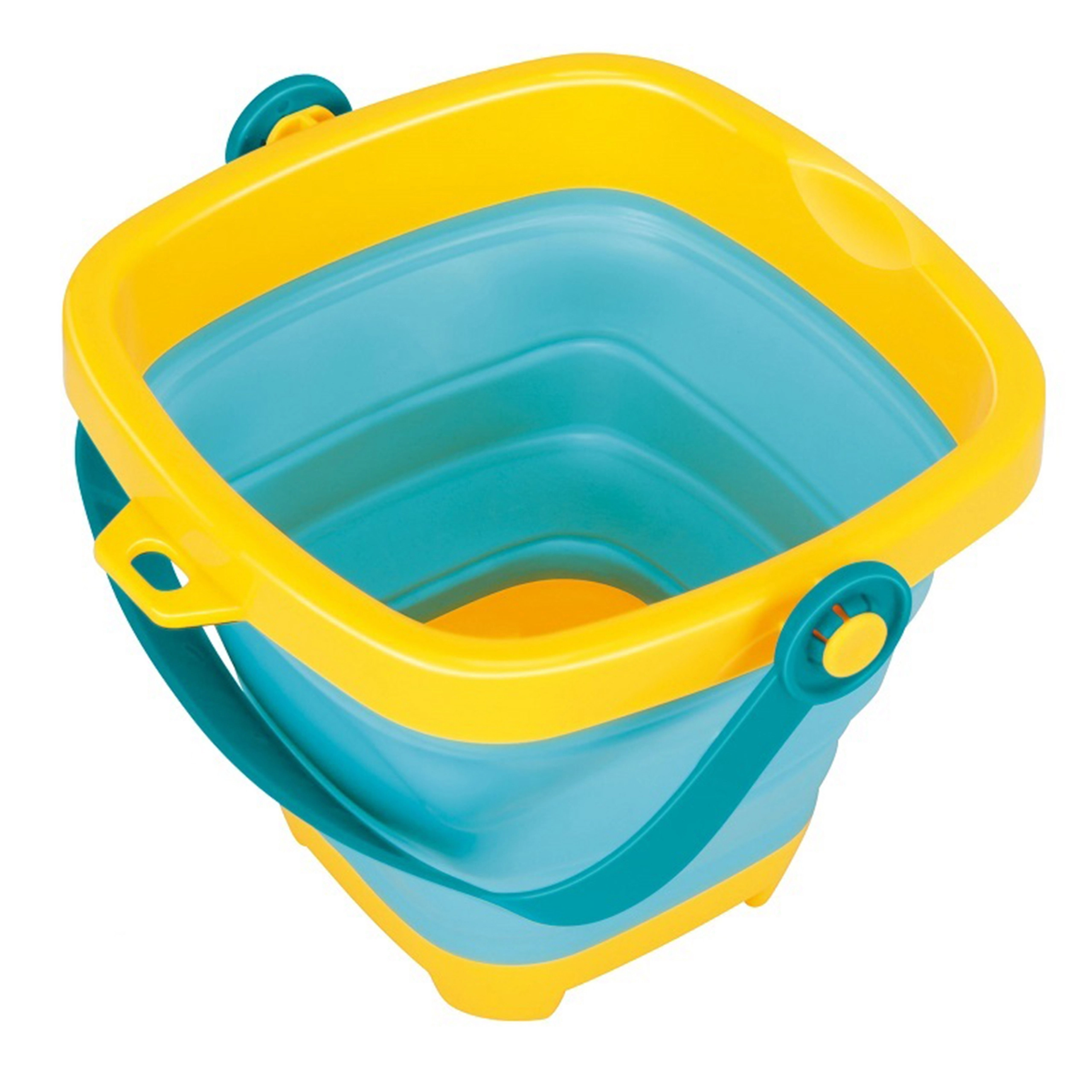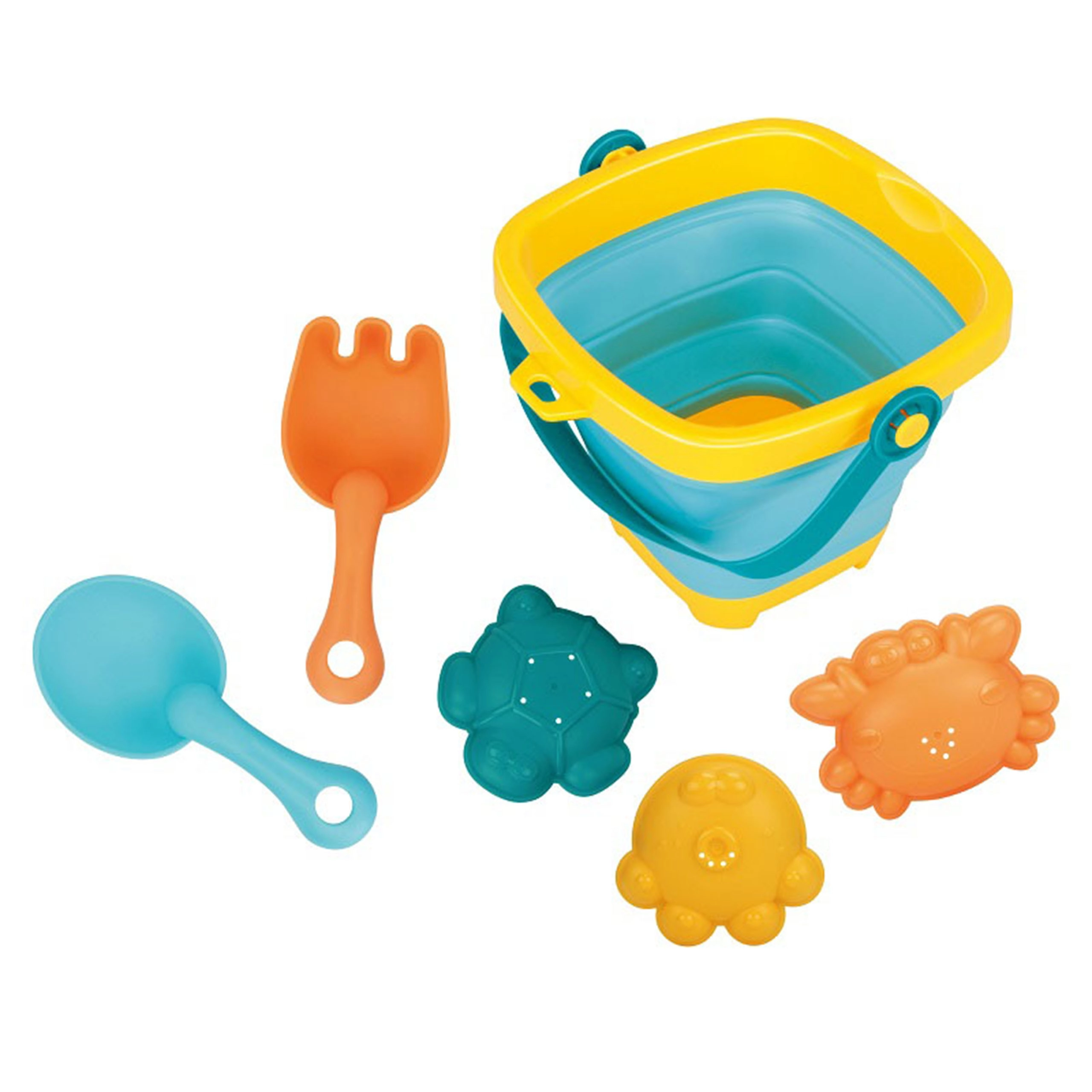 Praktická sada na písek a pláž pro děti od 12 měsíců: skládací silikonové vědro s plastovým okrajem a rukojetí, lopatka, hrábě a tři formičky. Díky harmonikovému skládání vědro šetří místo, je lehké na přenášení a ideální do batůžku, kočárku či plážové tašky. Odolné a pružné díly jsou skvělé do pískoviště, na pláž i na zahradu.