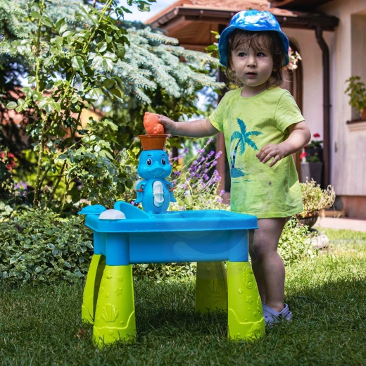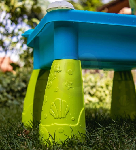 Stolek je dostatečně stabilní pro hru na zahradě, terase i v dětském pokojíčku. Díky bohaté sadě doplňků děti mohou nabírat, přelévat, formovat i tvořit vlastní vodní experimenty. Snadná montáž a skladná konstrukce zjednoduší přenášení i ukládání.