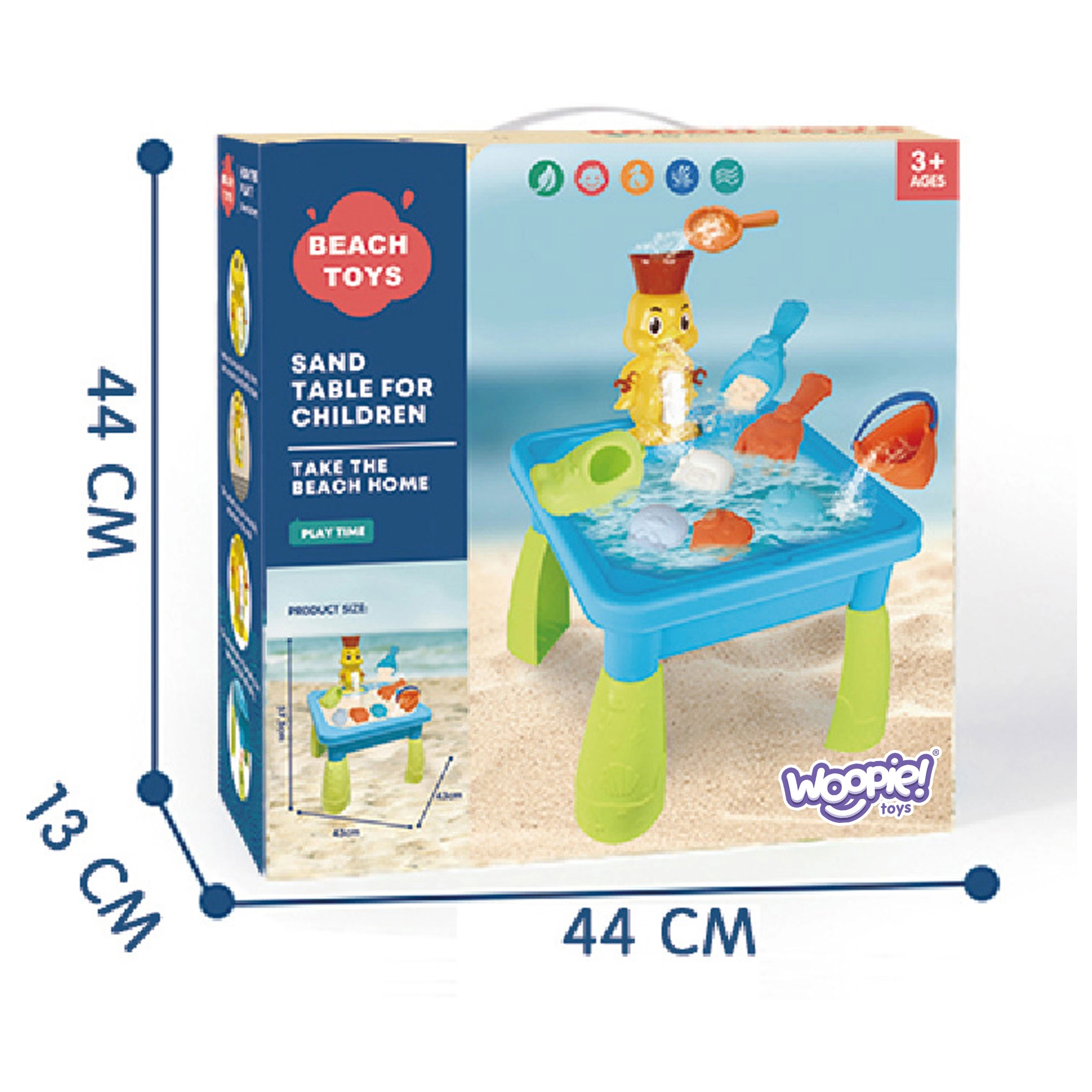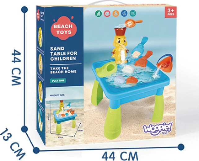 Zábavný dětský stolek 2v1 pro hru s vodou i pískem od značky WOOPIE přináší hodiny smyslové zábavy. Součástí je roztomilá kachnička s vodním kolotočem a efektem vodopádu, kterou lze díky přísavkám připevnit do vany či na zeď. Set obsahuje 9–10 doplňků včetně kyblíku, lopatek, hrábí a forem. Ideální pro hraní doma i venku, snadné skládání a montáž, vhodné od 3 let.